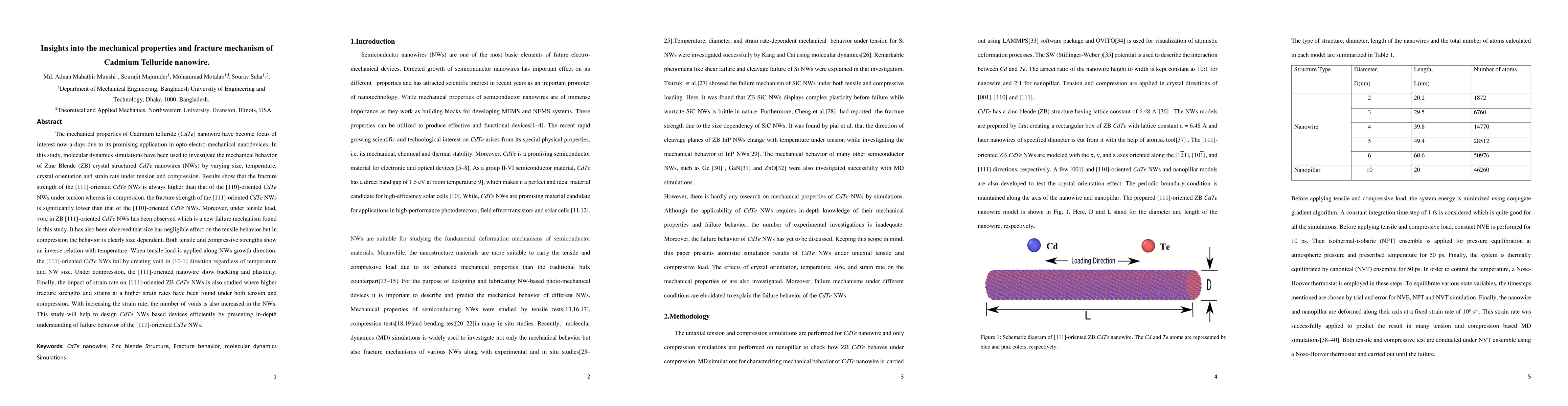 This study uses molecular dynamics simulations to explore the mechanical properties and fracture mechanisms of Zinc Blende structured CdTe nanowires under varying conditions. Results reveal that [111]-oriented CdTe nanowires exhibit higher tensile strength but lower compressive strength compared to [110]-oriented nanowires, with size having negligible effect on tensile but a significant impact on compressive behavior.