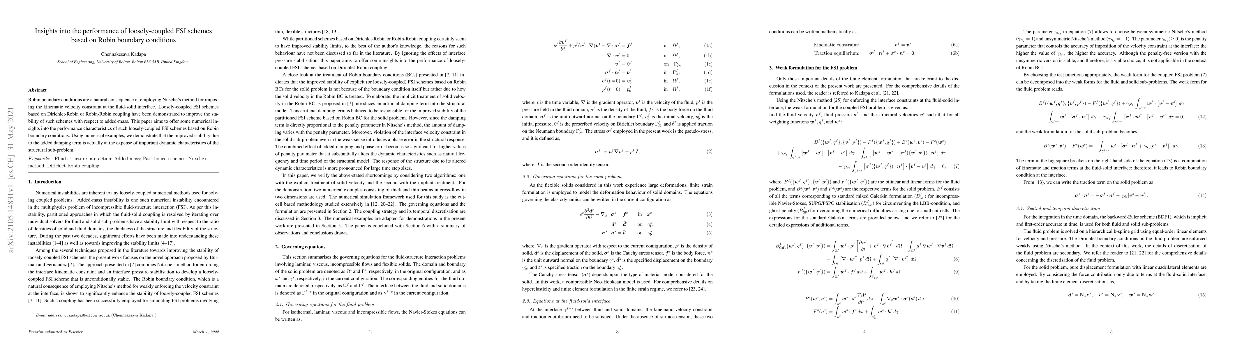 Robin boundary conditions are a natural consequence of employing Nitsche's method for imposing the kinematic velocity constraint at the fluid-solid interface. Loosely-coupled FSI schemes based on Dirichlet-Robin or Robin-Robin coupling have been demonstrated to improve the stability of such schemes with respect to added-mass. This paper aims to offer some numerical insights into the performance characteristics of such loosely-coupled FSI schemes based on Robin boundary conditions. Using numerical examples, we demonstrate that the improved stability due to the added damping term is actually at the expense of important dynamic characteristics of the structural sub-problem.