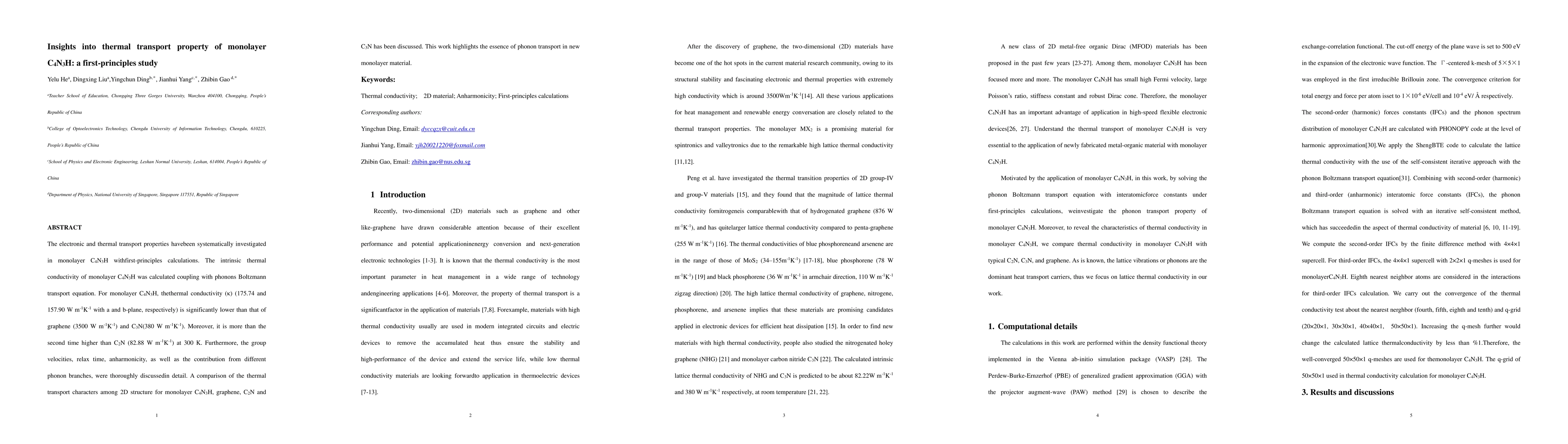 The electronic and thermal transport properties have been systematically investigated in monolayer C$_4$N$_3$H with first-principles calculations. The intrinsic thermal conductivity of monolayer C$_4$N$_3$H was calculated coupling with phonons Boltzmann transport equation. For monolayer C$_4$N$_3$H, the thermal conductivity (\k{appa}) (175.74 and 157.90 W m-1K-1 with a and b-plane, respectively) is significantly lower than that of graphene (3500 Wm$^{-1}$K$^{-1}$) and C3N(380 Wm$^{-1}$K$^{-1}$). Moreover, it is more than the second time higher than C$_2$N (82.88 Wm$^{-1}$K$^{-1}$) at 300 K. Furthermore, the group velocities, relax time, anharmonicity, as well as the contribution from different phonon branches, were thoroughly discussed in detail. A comparison of the thermal transport characters among 2D structure for monolayer C$_4$N$_3$H, graphene, C$_2$N and C$_3$N has been discussed. This work highlights the essence of phonon transport in new monolayer material.