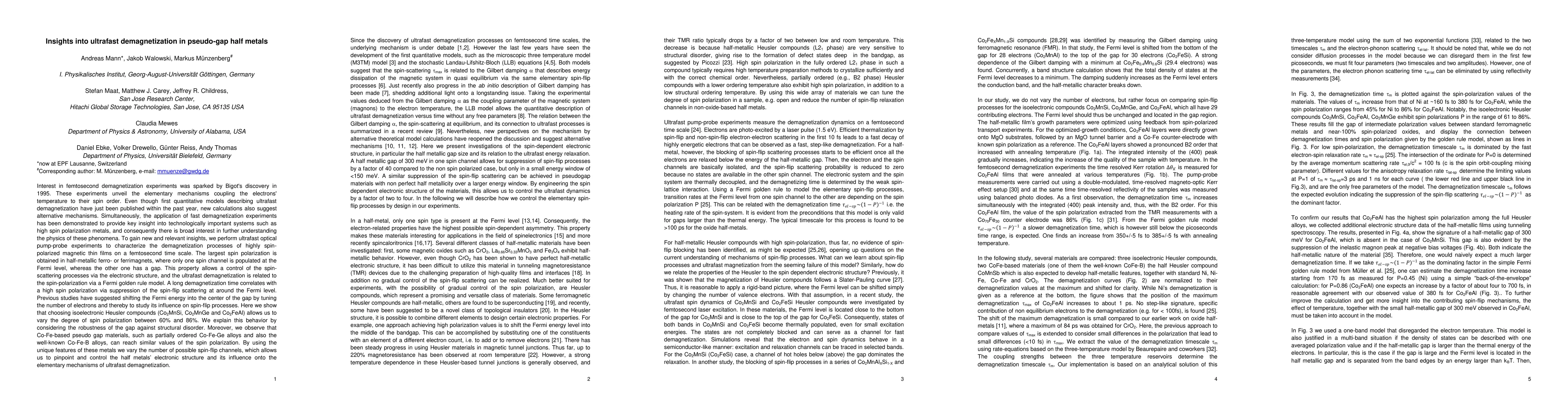 This research investigates ultrafast demagnetization in pseudo-gap half metals using femtosecond optical pump-probe experiments. It explores isoelectronic Heusler compounds and Co-Fe-based alloys to study their spin polarization and the mechanisms of ultrafast demagnetization, revealing the robustness of the pseudo-gap against structural disorder and its influence on spin-flip processes.