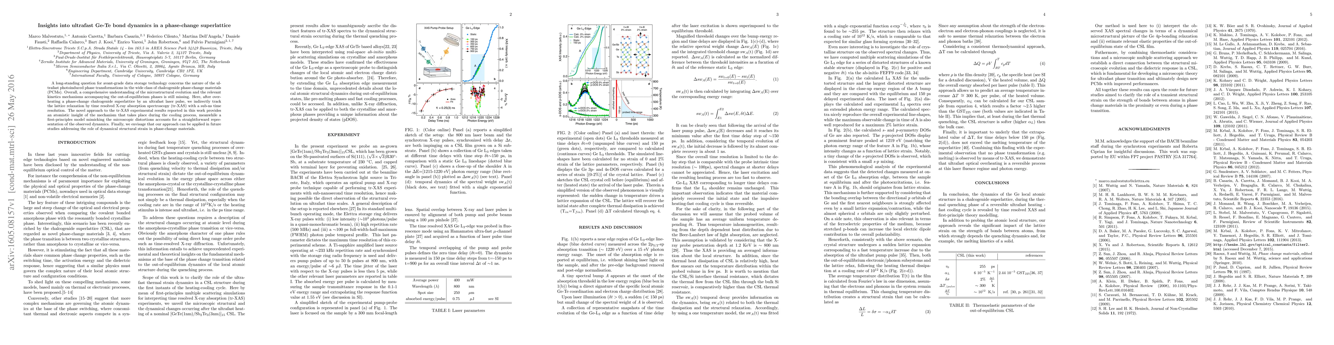 A long-standing question for avant-grade data storage technology concerns the nature of the ultrafast photoinduced phase transformations in the wide class of chalcogenide phase-change materials (PCMs). Overall, a comprehensive understanding of the microstructural evolution and the relevant kinetics mechanisms accompanying the out-of-equilibrium phases is still missing. Here, after overheating a phase-change chalcogenide superlattice by an ultrafast laser pulse, we indirectly track the lattice relaxation by time resolved X-ray absorption spectroscopy (tr-XAS) with a sub-ns time resolution. The novel approach to the tr-XAS experimental results reported in this work provides an atomistic insight of the mechanism that takes place during the cooling process, meanwhile a first-principles model mimicking the microscopic distortions accounts for a straightforward representation of the observed dynamics. Finally, we envisage that our approach can be applied in future studies addressing the role of dynamical structural strain in phase-change materials.
