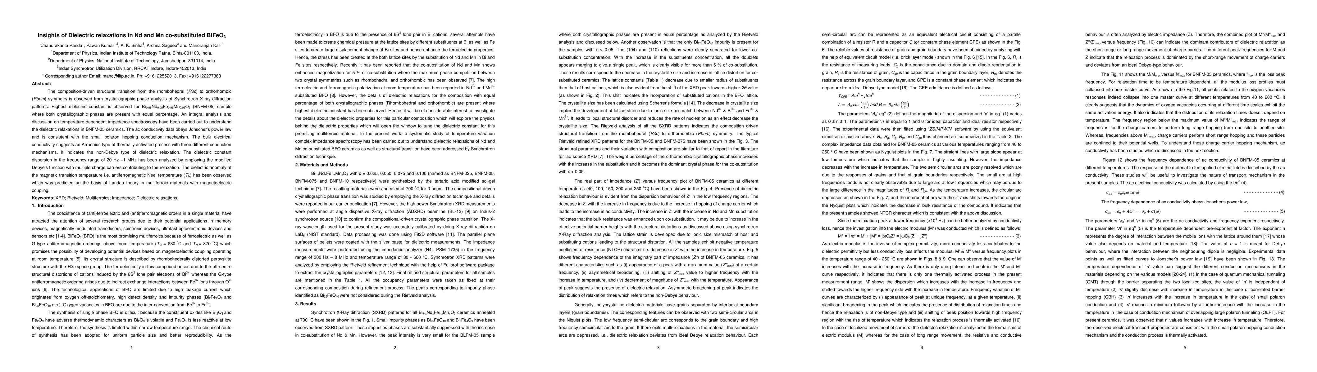 Researchers discovered a composition-driven transition in BiFeO3 with Nd and Mn co-substitution, showing a highest dielectric constant at specific levels of substitution. The study also found evidence of non-Debye type dielectric relaxation and conductivity explained by the small polaron hopping model.