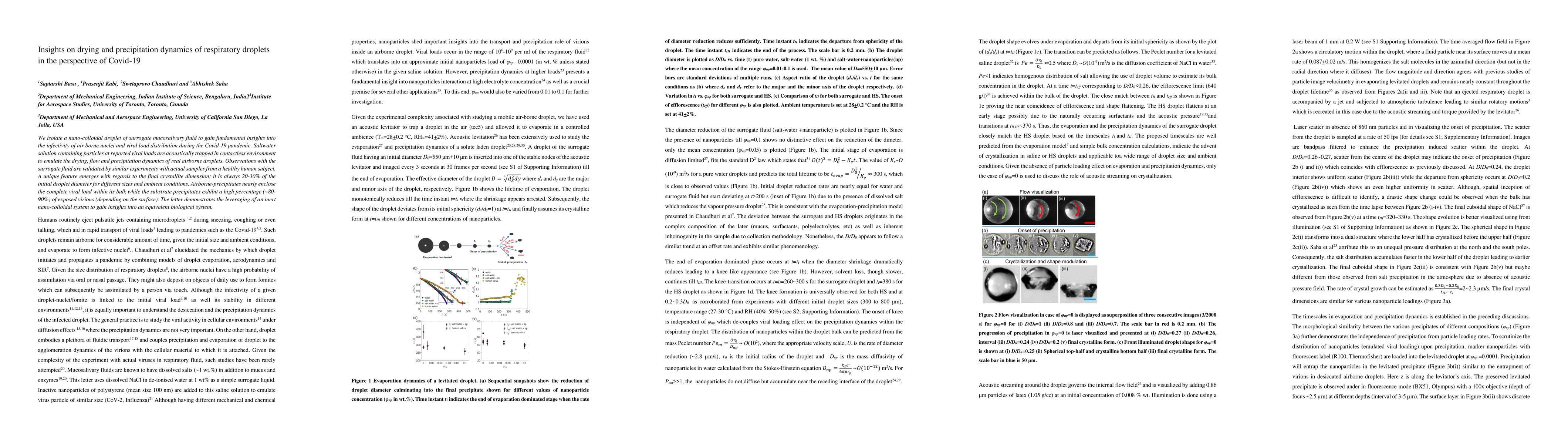 We isolate a nano-colloidal droplet of surrogate mucosalivary fluid to gain fundamental insights into the infectivity of air borne nuclei during the Covid-19 pandemic. Evaporation experiments are performed with salt-water solutions seeded with a viral load of inactive nanoparticles in an acoustic levitator. We seek to emulate the drying, flow and precipitation dynamics of such air borne mucosalivary droplets. Observations with the surrogate fluid are validated by similar experiments with actual samples from a healthy subject. A unique feature emerges with regards to the final crystallite dimension; it is always 20-30% of the initial droplet diameter for different sizes and ambient conditions. The preserved precipitates from levitated droplets show that 15% of the total virion population remain dispersed on the outer surface of air-desiccated air borne nuclei. This fraction increases to ~90% if the respiratory droplets (of larger initial size) settle on a surface and then evaporate in the sessile mode.
