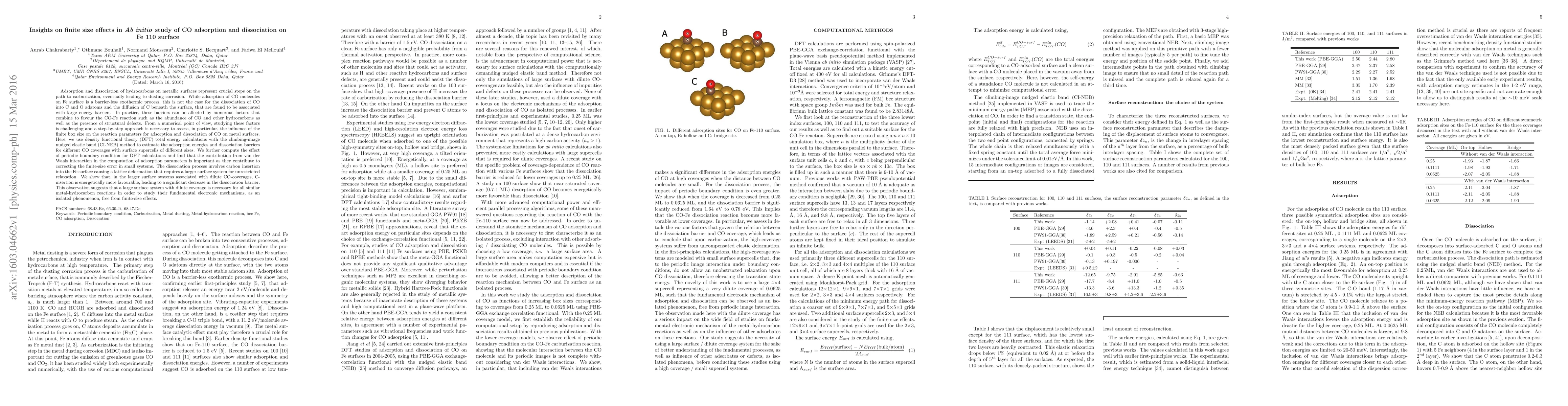 This paper investigates finite size effects in CO adsorption and dissociation on Fe 110 using density functional theory. It finds that van der Waals interactions significantly affect adsorption in small systems with high CO coverage, while larger surface systems with dilute CO coverage show decreased dissociation barriers due to elastic surface deformation.