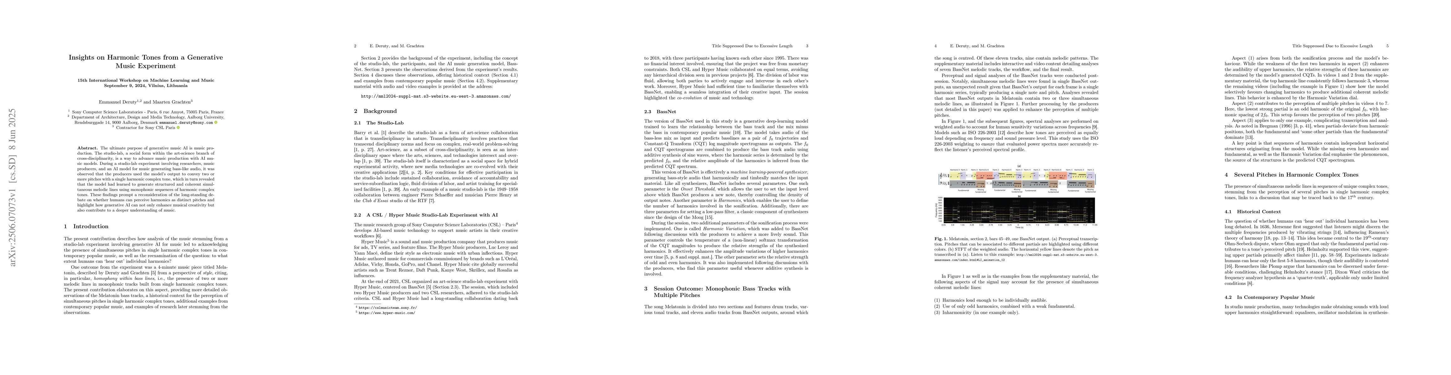 The ultimate purpose of generative music AI is music production. The studio-lab, a social form within the art-science branch of cross-disciplinarity, is a way to advance music production with AI music models. During a studio-lab experiment involving researchers, music producers, and an AI model for music generating bass-like audio, it was observed that the producers used the model's output to convey two or more pitches with a single harmonic complex tone, which in turn revealed that the model had learned to generate structured and coherent simultaneous melodic lines using monophonic sequences of harmonic complex tones. These findings prompt a reconsideration of the long-standing debate on whether humans can perceive harmonics as distinct pitches and highlight how generative AI can not only enhance musical creativity but also contribute to a deeper understanding of music.