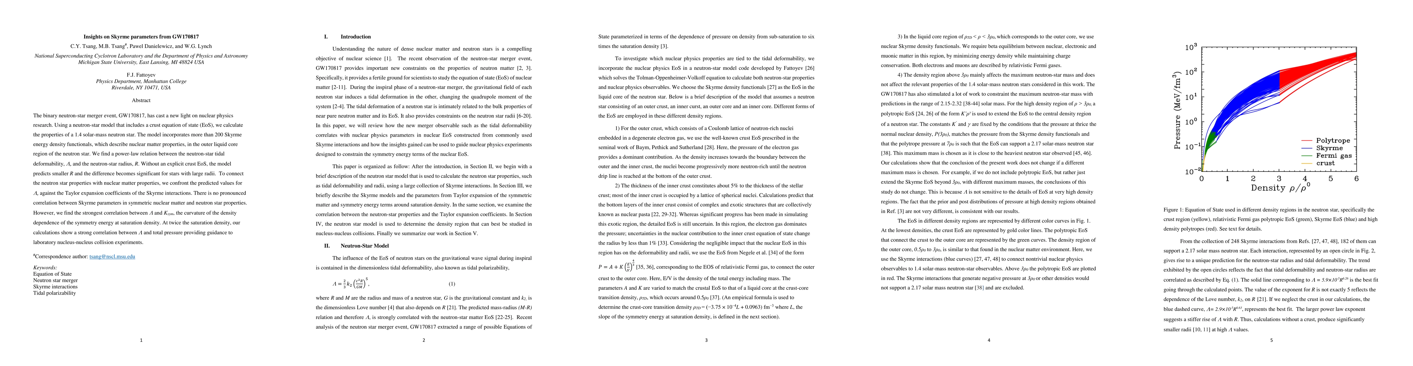 This research uses the GW170817 neutron-star merger event to study Skyrme parameters, finding a strong correlation between neutron-star tidal deformability and symmetry energy curvature at saturation density. Laboratory nucleus-nucleus collision experiments are suggested for further exploration.