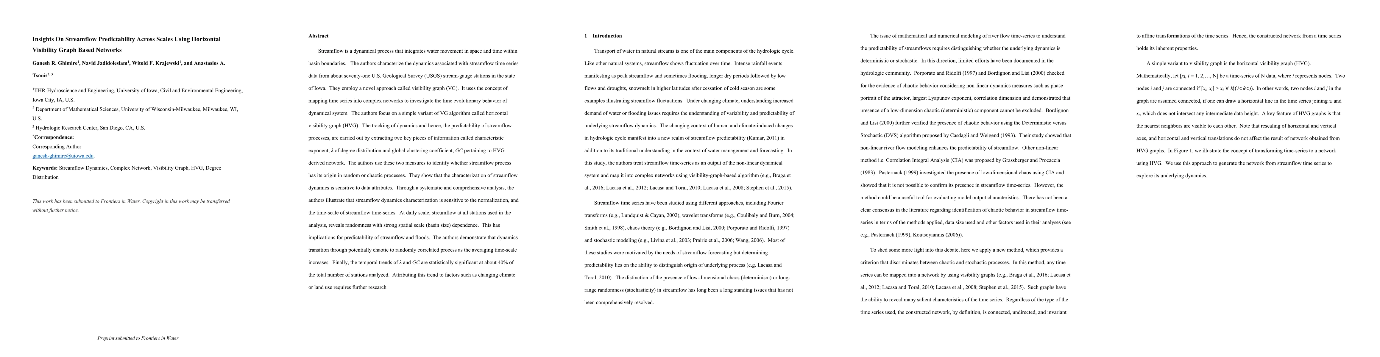 Streamflow is a dynamical process that integrates water movement in space and time within basin boundaries. The authors characterize the dynamics associated with streamflow time series data from about seventy-one U.S. Geological Survey (USGS) stream-gauge stations in the state of Iowa. They employ a novel approach called visibility graph (VG). It uses the concept of mapping time series into complex networks to investigate the time evolutionary behavior of dynamical system. The authors focus on a simple variant of VG algorithm called horizontal visibility graph (HVG). The tracking of dynamics and hence, the predictability of streamflow processes, are carried out by extracting two key pieces of information called characteristic exponent, {\lambda} of degree distribution and global clustering coefficient, GC pertaining to HVG derived network. The authors use these two measures to identify whether streamflow process has its origin in random or chaotic processes. They show that the characterization of streamflow dynamics is sensitive to data attributes. Through a systematic and comprehensive analysis, the authors illustrate that streamflow dynamics characterization is sensitive to the normalization, and the time-scale of streamflow time-series. At daily scale, streamflow at all stations used in the analysis, reveals randomness with strong spatial scale (basin size) dependence. This has implications for predictability of streamflow and floods. The authors demonstrate that dynamics transition through potentially chaotic to randomly correlated process as the averaging time-scale increases. Finally, the temporal trends of {\lambda} and GC are statistically significant at about 40% of the total number of stations analyzed. Attributing this trend to factors such as changing climate or land use requires further research.