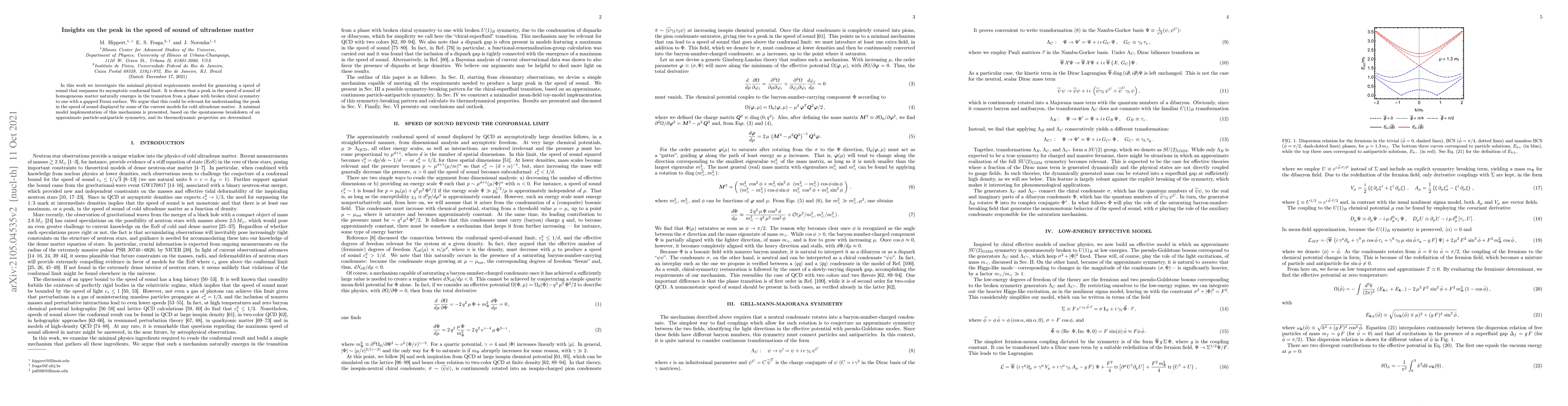 In this work we investigate the minimal physical requirements needed for generating a speed of sound that surpasses its asymptotic conformal limit. It is shown that a peak in the speed of sound of homogeneous matter naturally emerges in the transition from a phase with broken chiral symmetry to one with a gapped Fermi surface. We argue that this could be relevant for understanding the peak in the speed of sound displayed by some of the current models for cold ultradense matter. A minimal model implementation of this mechanism is presented, based on the spontaneous breakdown of an approximate particle-antiparticle symmetry, and its thermodynamic properties are determined.