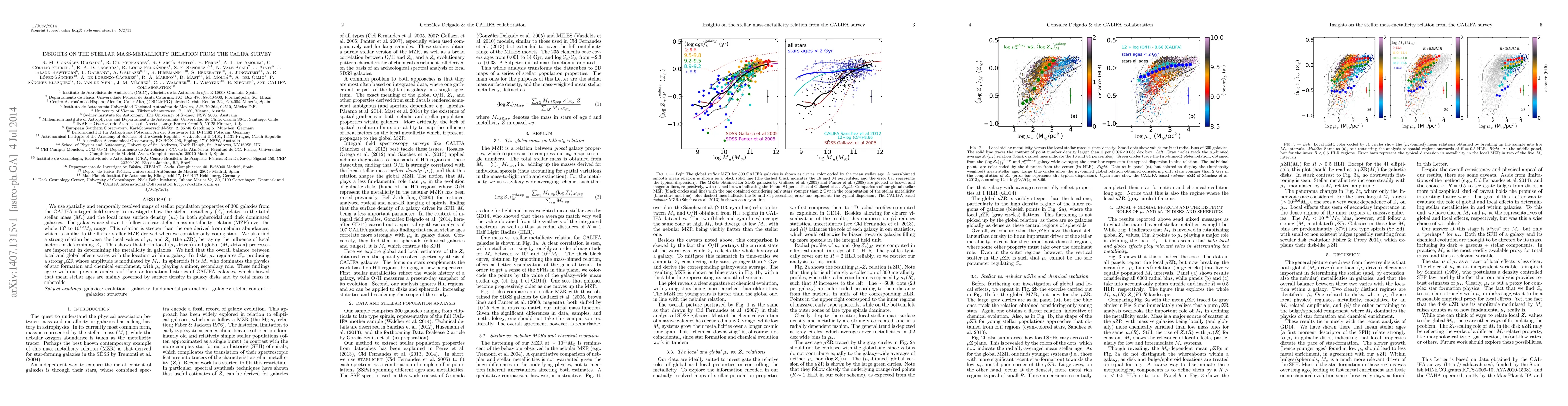 This paper investigates the stellar mass-metallicity relation (MZR) using data from the CALIFA survey, revealing that galaxies follow a clear MZR across a wide stellar mass range. It also finds a strong local mass surface density-metallicity relation (μZR), indicating that both local and global factors influence stellar metallicity, with varying importance depending on whether the region is in a disk or a spheroid.