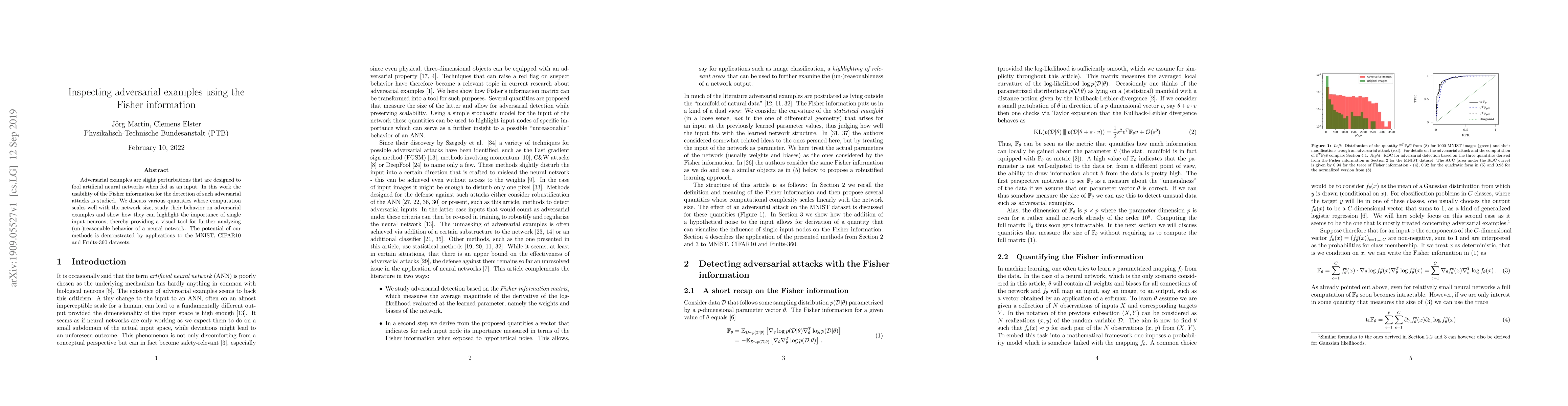 Adversarial examples are slight perturbations that are designed to fool artificial neural networks when fed as an input. In this work the usability of the Fisher information for the detection of such adversarial attacks is studied. We discuss various quantities whose computation scales well with the network size, study their behavior on adversarial examples and show how they can highlight the importance of single input neurons, thereby providing a visual tool for further analyzing (un-)reasonable behavior of a neural network. The potential of our methods is demonstrated by applications to the MNIST, CIFAR10 and Fruits-360 datasets.