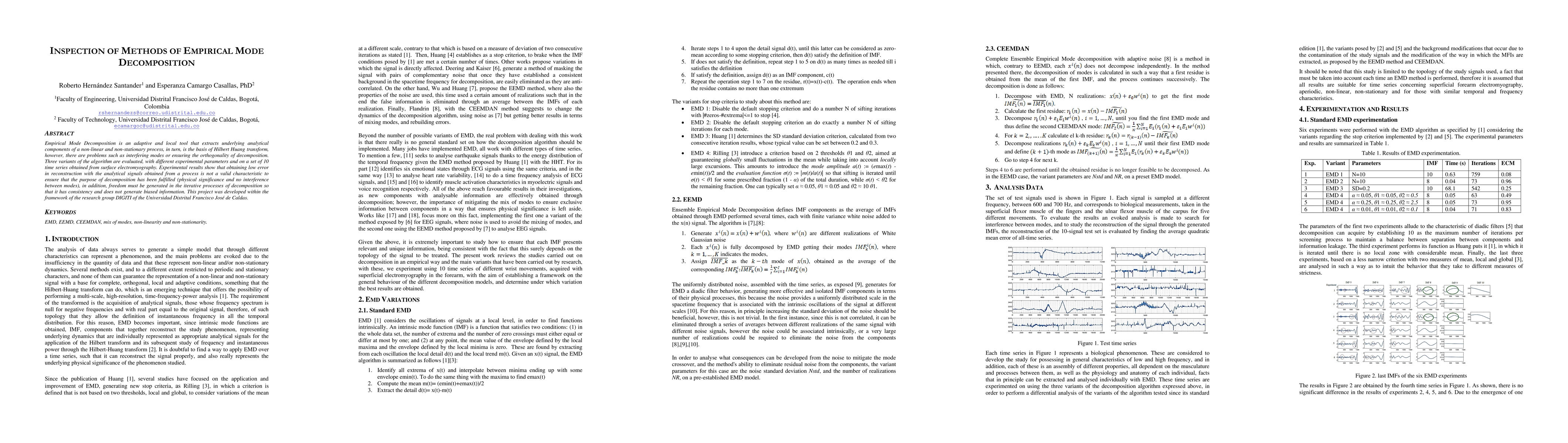 Empirical Mode Decomposition is an adaptive and local tool that extracts underlying analytical components of a non-linear and non-stationary process, in turn, is the basis of Hilbert Huang transform, however, there are problems such as interfering modes or ensuring the orthogonality of decomposition. Three variants of the algorithm are evaluated, with different experimental parameters and on a set of 10 time series obtained from surface electromyography. Experimental results show that obtaining low error in reconstruction with the analytical signals obtained from a process is not a valid characteristic to ensure that the purpose of decomposition has been fulfilled (physical significance and no interference between modes), in addition, freedom must be generated in the iterative processes of decomposition so that it has consistency and does not generate biased information. This project was developed within the framework of the research group DIGITI of the Universidad Distrital Francisco Jos\'e de Caldas.