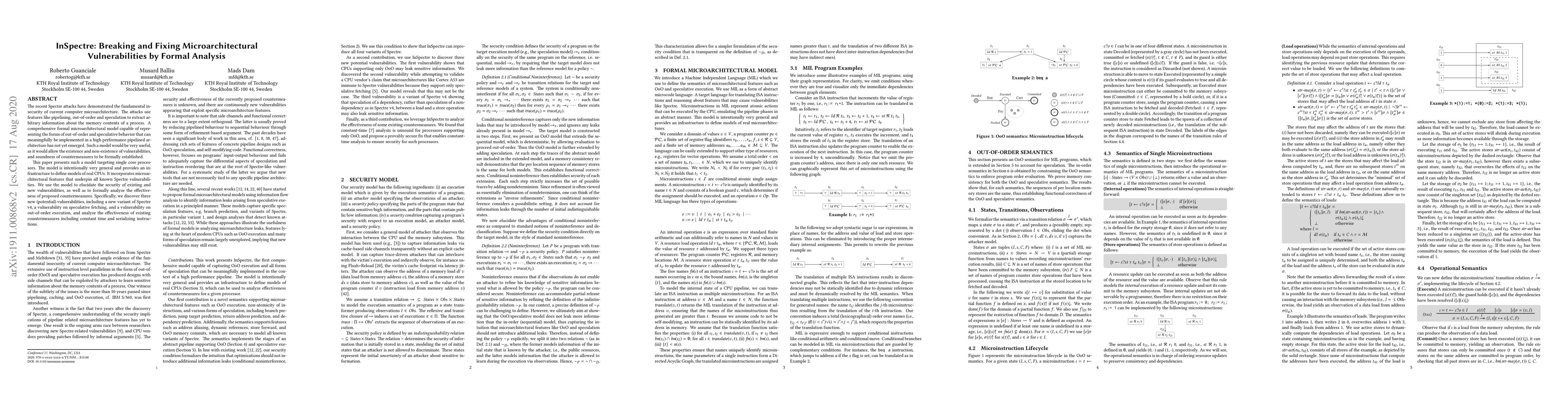 The recent Spectre attacks has demonstrated the fundamental insecurity of current computer microarchitecture. The attacks use features like pipelining, out-of-order and speculation to extract arbitrary information about the memory contents of a process. A comprehensive formal microarchitectural model capable of representing the forms of out-of-order and speculative behavior that can meaningfully be implemented in a high performance pipelined architecture has not yet emerged. Such a model would be very useful, as it would allow the existence and non-existence of vulnerabilities, and soundness of countermeasures to be formally established. In this paper we present such a model targeting single core processors. The model is intentionally very general and provides an infrastructure to define models of real CPUs. It incorporates microarchitectural features that underpin all known Spectre vulnerabilities. We use the model to elucidate the security of existing and new vulnerabilities, as well as to formally analyze the effectiveness of proposed countermeasures. Specifically, we discover three new (potential) vulnerabilities, including a new variant of Spectre v4, a vulnerability on speculative fetching, and a vulnerability on out-of-order execution, and analyze the effectiveness of three existing countermeasures: constant time, Retpoline, and ARM's Speculative Store Bypass Safe (SSBS).