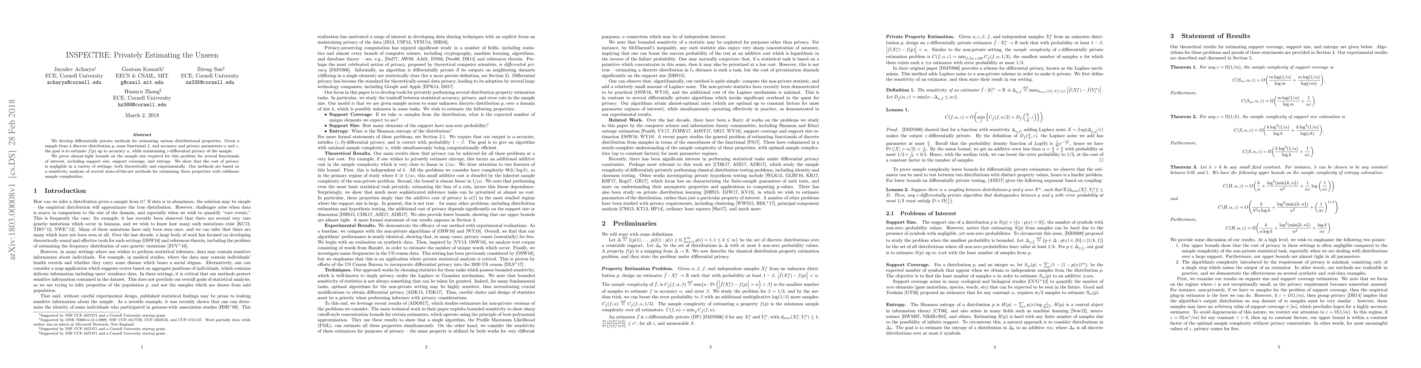 This paper develops differentially private methods for estimating distributional properties with high accuracy and low privacy costs, achieving significant sample size reductions in various settings.