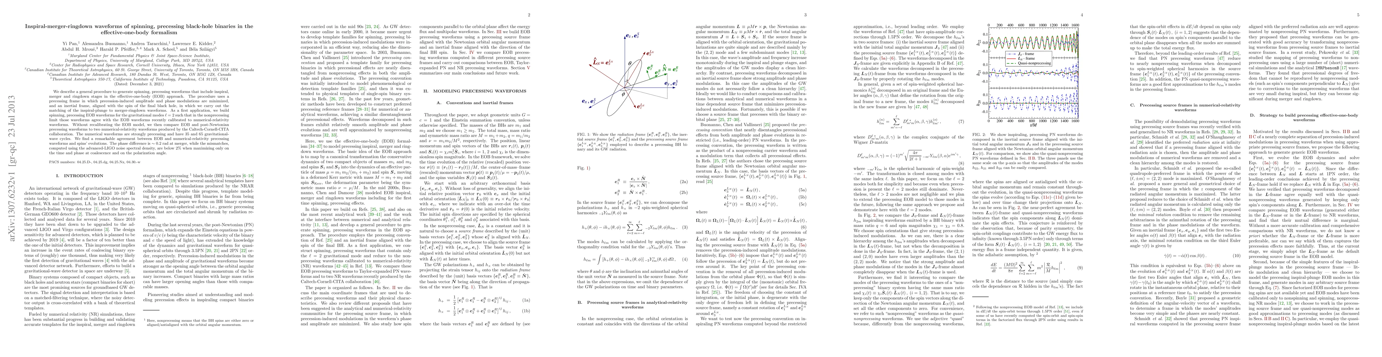 The paper describes a procedure to generate spinning, precessing waveforms for black-hole binaries using the effective-one-body (EOB) formalism, involving a precessing frame to minimize precession-induced modulations and an inertial frame aligned with the final black hole's spin for matching inspiral-plunge to merger-ringdown waveforms.