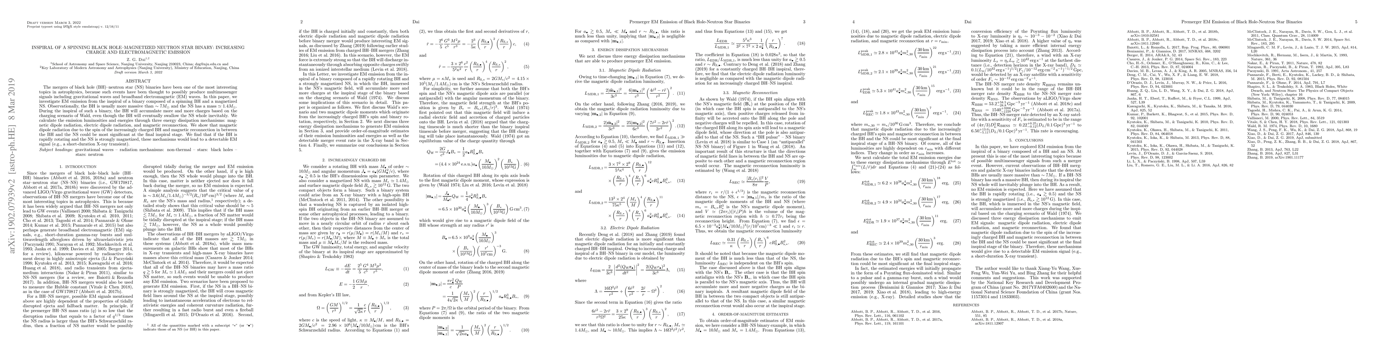 This paper investigates electromagnetic emissions during the inspiral of a spinning black hole and magnetized neutron star binary, focusing on charge accumulation and energy dissipation mechanisms. It finds that magnetic dipole radiation and magnetic reconnection could produce significant electromagnetic signals detectable as short-duration X-ray transients.