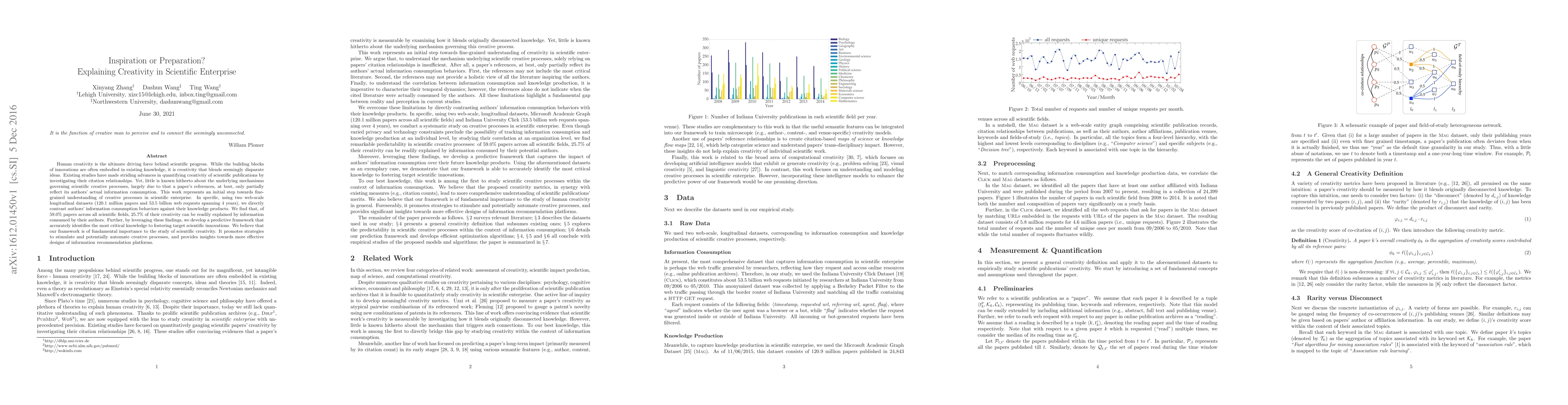 Human creativity is the ultimate driving force behind scientific progress. While the building blocks of innovations are often embodied in existing knowledge, it is creativity that blends seemingly disparate ideas. Existing studies have made striding advances in quantifying creativity of scientific publications by investigating their citation relationships. Yet, little is known hitherto about the underlying mechanisms governing scientific creative processes, largely due to that a paper's references, at best, only partially reflect its authors' actual information consumption. This work represents an initial step towards fine-grained understanding of creative processes in scientific enterprise. In specific, using two web-scale longitudinal datasets (120.1 million papers and 53.5 billion web requests spanning 4 years), we directly contrast authors' information consumption behaviors against their knowledge products. We find that, of 59.0\% papers across all scientific fields, 25.7\% of their creativity can be readily explained by information consumed by their authors. Further, by leveraging these findings, we develop a predictive framework that accurately identifies the most critical knowledge to fostering target scientific innovations. We believe that our framework is of fundamental importance to the study of scientific creativity. It promotes strategies to stimulate and potentially automate creative processes, and provides insights towards more effective designs of information recommendation platforms.