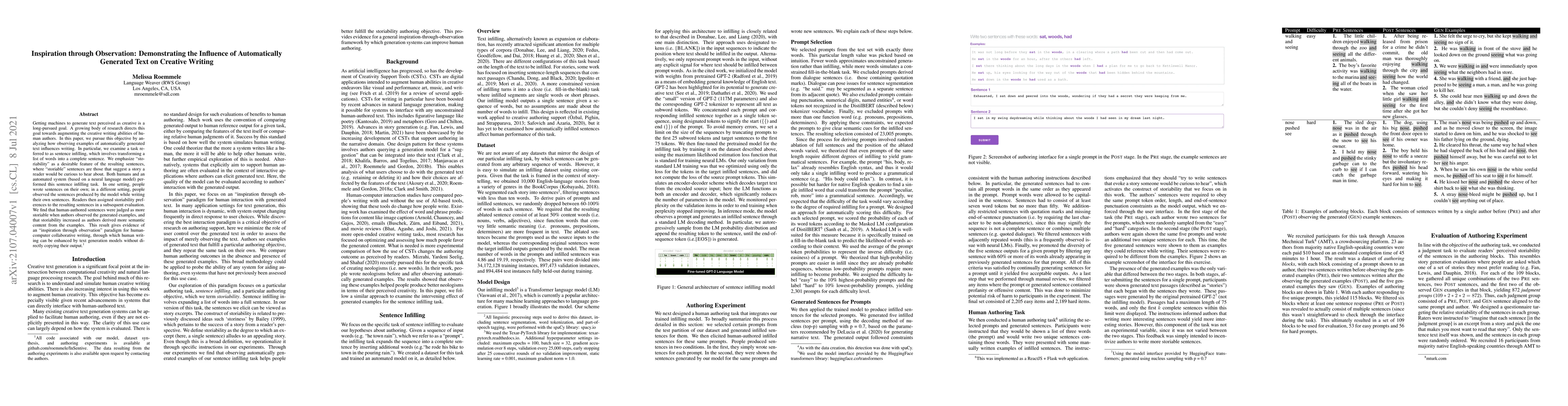 Getting machines to generate text perceived as creative is a long-pursued goal. A growing body of research directs this goal towards augmenting the creative writing abilities of human authors. In this paper, we pursue this objective by analyzing how observing examples of automatically generated text influences writing. In particular, we examine a task referred to as sentence infilling, which involves transforming a list of words into a complete sentence. We emphasize "storiability" as a desirable feature of the resulting sentences, where "storiable" sentences are those that suggest a story a reader would be curious to hear about. Both humans and an automated system (based on a neural language model) performed this sentence infilling task. In one setting, people wrote sentences on their own; in a different setting, people observed the sentences produced by the model while writing their own sentences. Readers then assigned storiability preferences to the resulting sentences in a subsequent evaluation. We find that human-authored sentences were judged as more storiable when authors observed the generated examples, and that storiability increased as authors derived more semantic content from the examples. This result gives evidence of an "inspiration through observation" paradigm for human-computer collaborative writing, through which human writing can be enhanced by text generation models without directly copying their output.