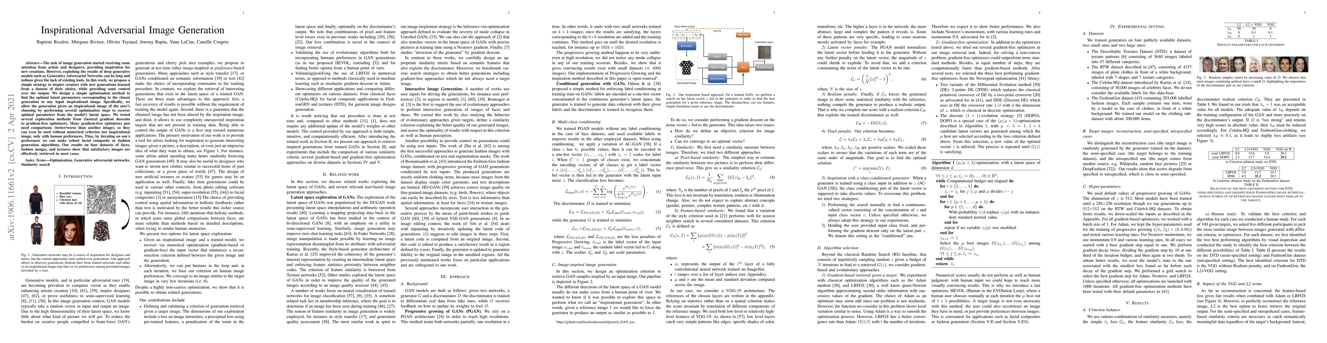 The task of image generation started to receive some attention from artists and designers to inspire them in new creations. However, exploiting the results of deep generative models such as Generative Adversarial Networks can be long and tedious given the lack of existing tools. In this work, we propose a simple strategy to inspire creators with new generations learned from a dataset of their choice, while providing some control on them. We design a simple optimization method to find the optimal latent parameters corresponding to the closest generation to any input inspirational image. Specifically, we allow the generation given an inspirational image of the user choice by performing several optimization steps to recover optimal parameters from the model's latent space. We tested several exploration methods starting with classic gradient descents to gradient-free optimizers. Many gradient-free optimizers just need comparisons (better/worse than another image), so that they can even be used without numerical criterion, without inspirational image, but with only with human preference. Thus, by iterating on one's preferences we could make robust Facial Composite or Fashion Generation algorithms. High resolution of the produced design generations are obtained using progressive growing of GANs. Our results on four datasets of faces, fashion images, and textures show that satisfactory images are effectively retrieved in most cases.