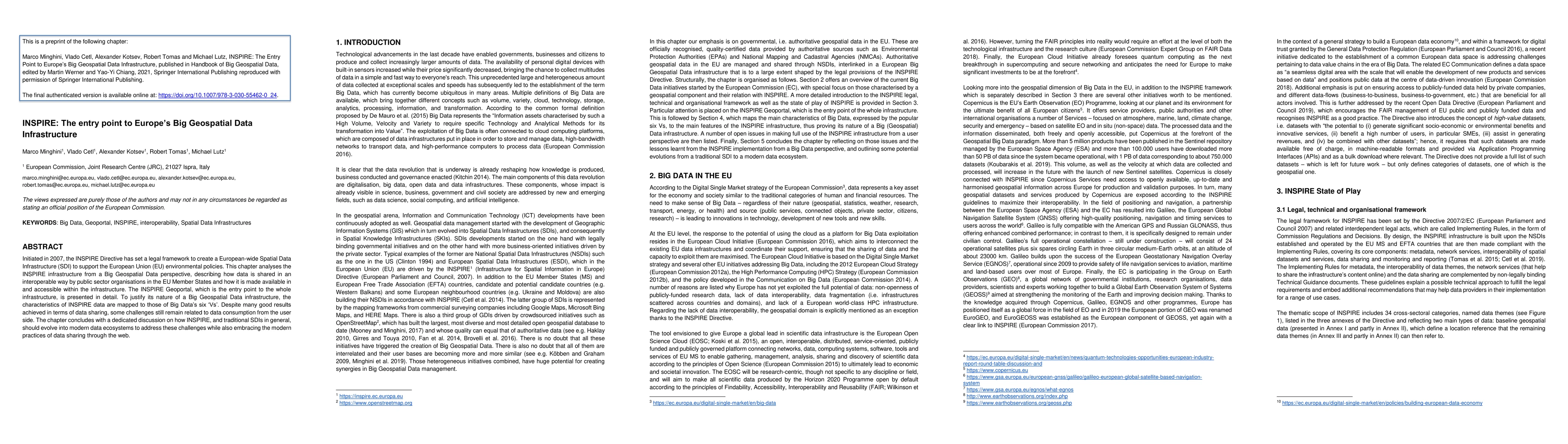 The INSPIRE Directive, established in 2007, is examined as Europe's Big Geospatial Data Infrastructure, ensuring interoperable data sharing among EU public sector organizations. The INSPIRE Geoportal, its entry point, is detailed. INSPIRE data aligns with Big Data's 'Vs', though user-side data consumption presents challenges. The paper suggests that INSPIRE and traditional SDIs should evolve to modern data ecosystems for improved data sharing practices.