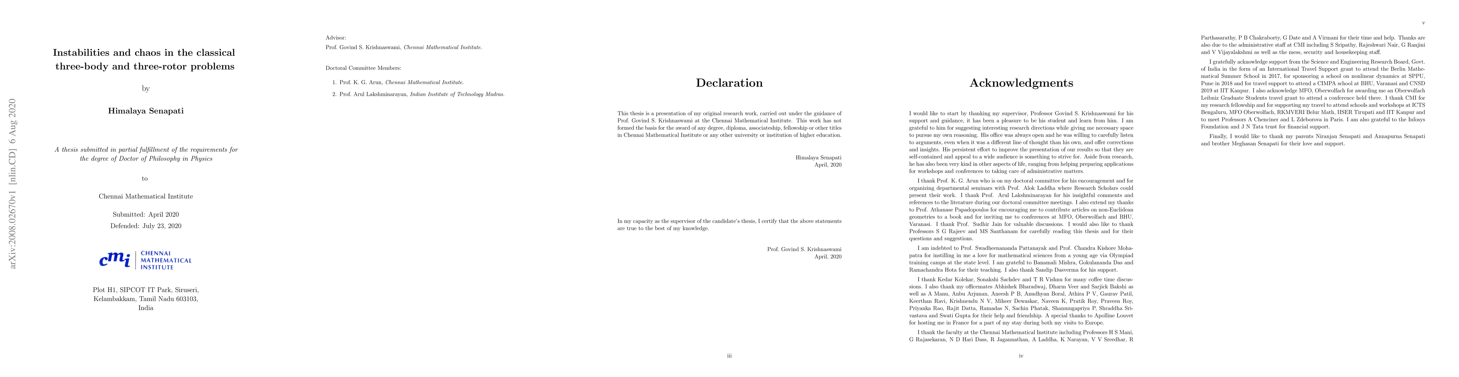 This paper investigates instabilities and chaos in the planar three-body problem and the three-rotor problem, using geometric and Riemannian approaches. It finds widespread geodesic instabilities and a sharp transition to chaos in the three-rotor system characterized by symmetry breaking and ergodicity.