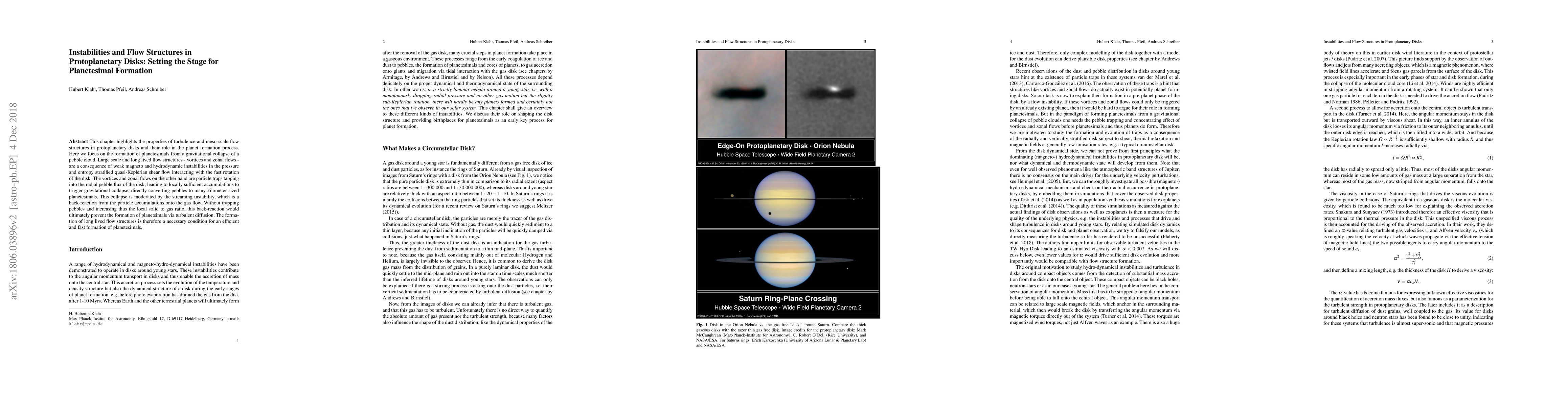 This chapter highlights the properties of turbulence and meso-scale flow structures in protoplanetary disks and their role in the planet formation process. Here we focus on the formation of planetesimals from a gravitational collapse of a pebble cloud. Large scale and long lived flow structures - vortices and zonal flows - are a consequence of weak magneto and hydrodynamic instabilities in the pressure and entropy stratified quasi-Keplerian shear flow interacting with the fast rotation of the disk. The vortices and zonal flows on the other hand are particle traps tapping into the radial pebble flux of the disk, leading to locally sufficient accumulations to trigger gravitational collapse, directly converting pebbles to many kilometer sized planetesimals. This collapse is moderated by the streaming instability, which is a back-reaction from the particle accumulations onto the gas flow. Without trapping pebbles and increasing thus the local solid to gas ratio, this back-reaction would ultimately prevent the formation of planetsimals via turbulent diffusion. The formation of long lived flow structures is therefore a necessary condition for an efficient and fast formation of planetesimals.
