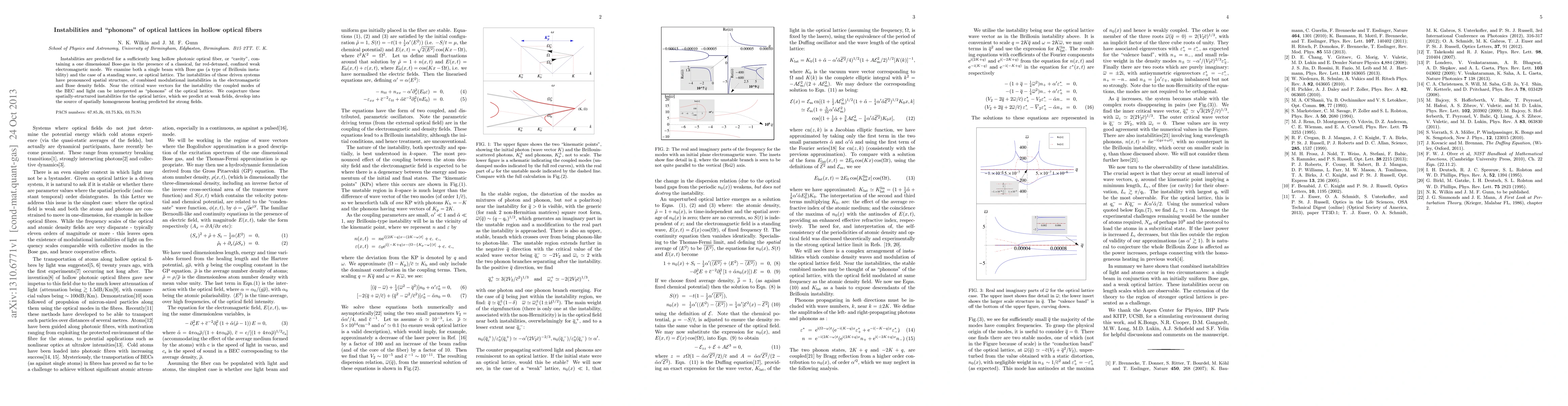 Instabilities are predicted for a sufficiently long hollow photonic optical fiber, or "cavity", containing a one dimensional Bose-gas in the presence of a classical, far red-detuned, confined weak electromagnetic mode. We examine both a single beam with Bose gas (a type of Brillouin instability) and the case of a standing wave, or optical lattice. The instabilities of these driven systems have pronounced spatial structure, of combined modulational instabilities in the electromagnetic and Bose density fields. Near the critical wave vectors for the instability the coupled modes of the BEC and light can be interpreted as "phonons" of the optical lattice. We conjecture these spatially-structured instabilities for the optical lattice, which we predict at weak fields, develop into the source of spatially homogeneous heating predicted for strong fields.