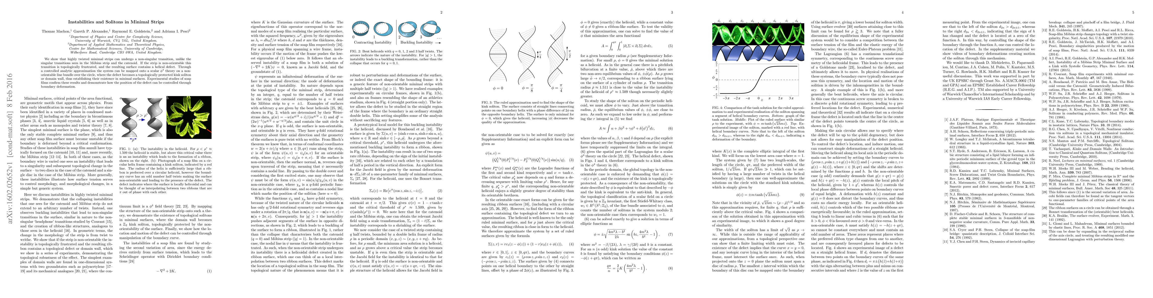 We show that highly twisted minimal strips can undergo a non-singular transition, unlike the singular transitions seen in the M\"obius strip and the catenoid. If the strip is non-orientable this transition is topologically frustrated, and the resulting surface contains a helical defect. Through a controlled analytic approximation the system can be mapped onto a scalar $\phi^4$ theory on a non-orientable line bundle over the circle, where the defect becomes a topologically protected kink soliton or domain wall, thus establishing their existence in minimal surfaces. Experimental studies of soap films confirm these results and demonstrate how the position of the defect can be controlled through boundary deformation.