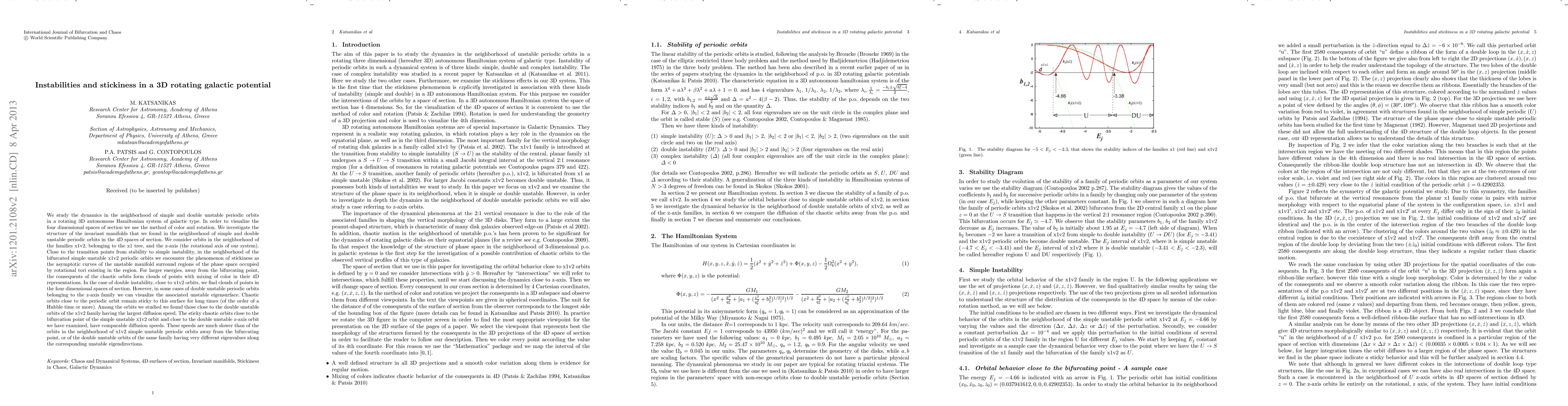 Researchers studied instabilities and stickiness in rotating 3D galactic potentials, finding that chaotic orbits near double unstable periodic orbits can remain 'sticky' to a specific surface for long times.