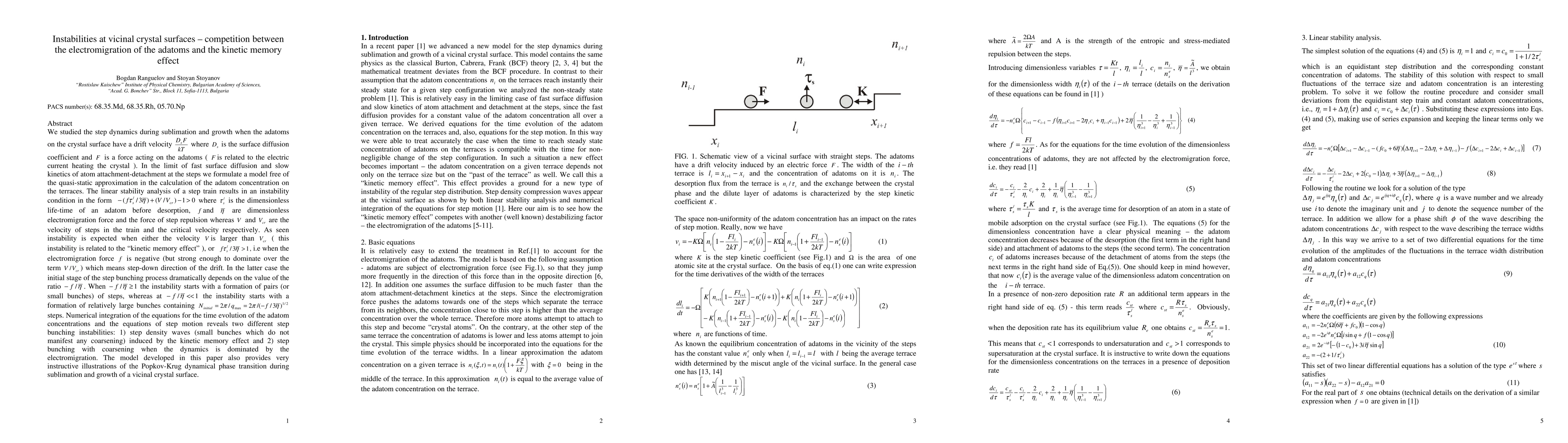 This paper investigates step dynamics on vicinal crystal surfaces under electromigration and kinetic memory effects, revealing two step bunching instabilities: step density waves induced by kinetic memory and step bunching with coarsening dominated by electromigration. The model developed avoids the quasi-static approximation and provides insights into the Popkov-Krug dynamical phase transition.