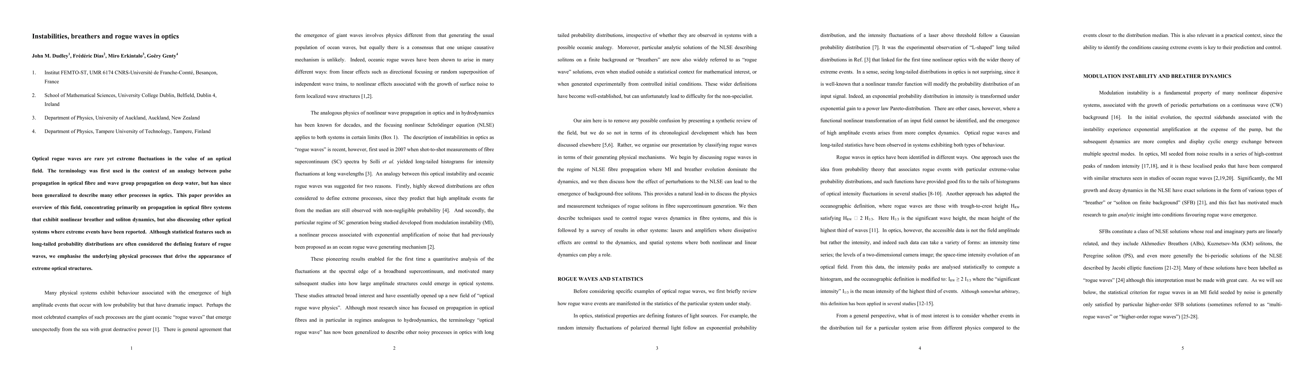 Optical rogue waves are rare yet extreme fluctuations in the value of an optical field. The terminology was first used in the context of an analogy between pulse propagation in optical fibre and wave group propagation on deep water, but has since been generalized to describe many other processes in optics. This paper provides an overview of this field, concentrating primarily on propagation in optical fibre systems that exhibit nonlinear breather and soliton dynamics, but also discussing other optical systems where extreme events have been reported. Although statistical features such as long-tailed probability distributions are often considered the defining feature of rogue waves, we emphasise the underlying physical processes that drive the appearance of extreme optical structures.