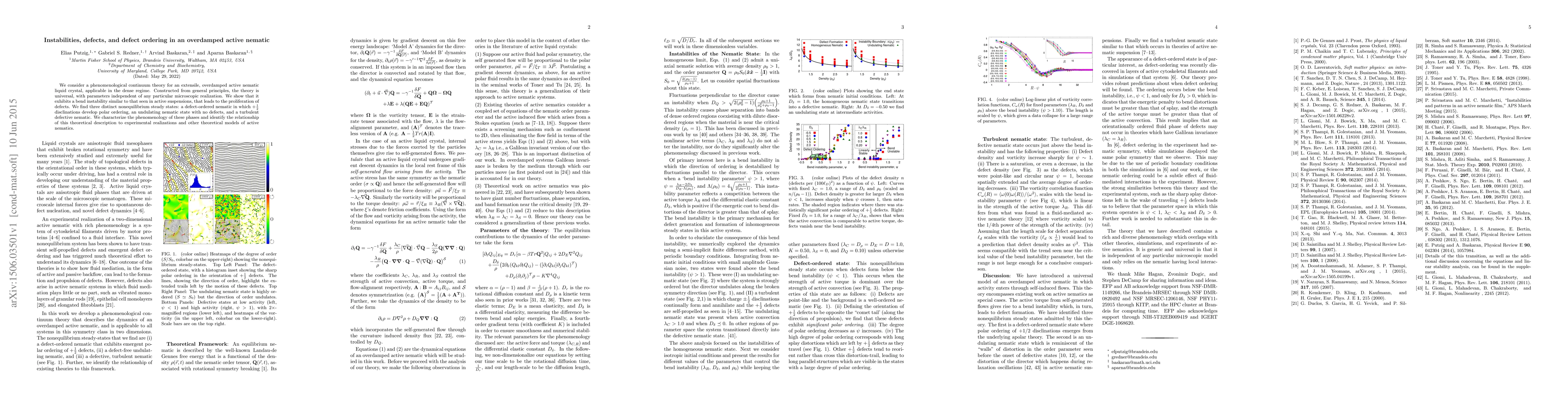 This paper develops a universal continuum theory for dense, overdamped active nematic liquid crystals, revealing a bend instability that generates defects. It identifies three nonequilibrium steady states: a defect-ordered nematic, an undulation-dominated state, and a turbulent defective phase.