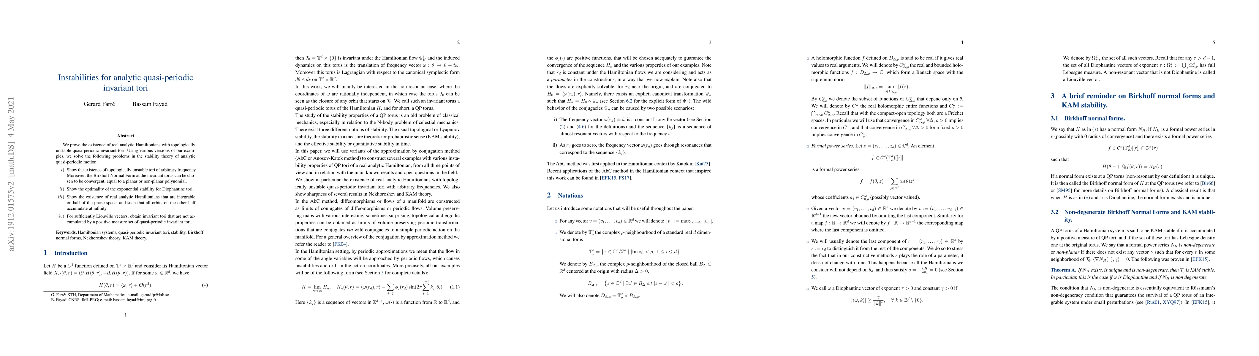 We prove the existence of real analytic Hamiltonians with topologically unstable quasi-periodic invariant tori. Using various versions of our examples, we solve the following problems in the stability theory of analytic quasi-periodic motion: $\quad i)$ Show the existence of topologically unstable tori of arbitrary frequency. Moreover, the Birkhoff Normal Form at the invariant torus can be chosen to be convergent, equal to a planar or non-planar polynomial. $\quad ii)$ Show the optimality of the exponential stability for Diophantine tori. ' $\quad iii)$ Show the existence of real analytic Hamiltonians that are integrable on half of the phase space, and such that all orbits on the other half accumulate at infinity. $\quad iv)$ For sufficiently Liouville vectors, obtain invariant tori that are not accumulated by a positive measure set of quasi-periodic invariant tori.