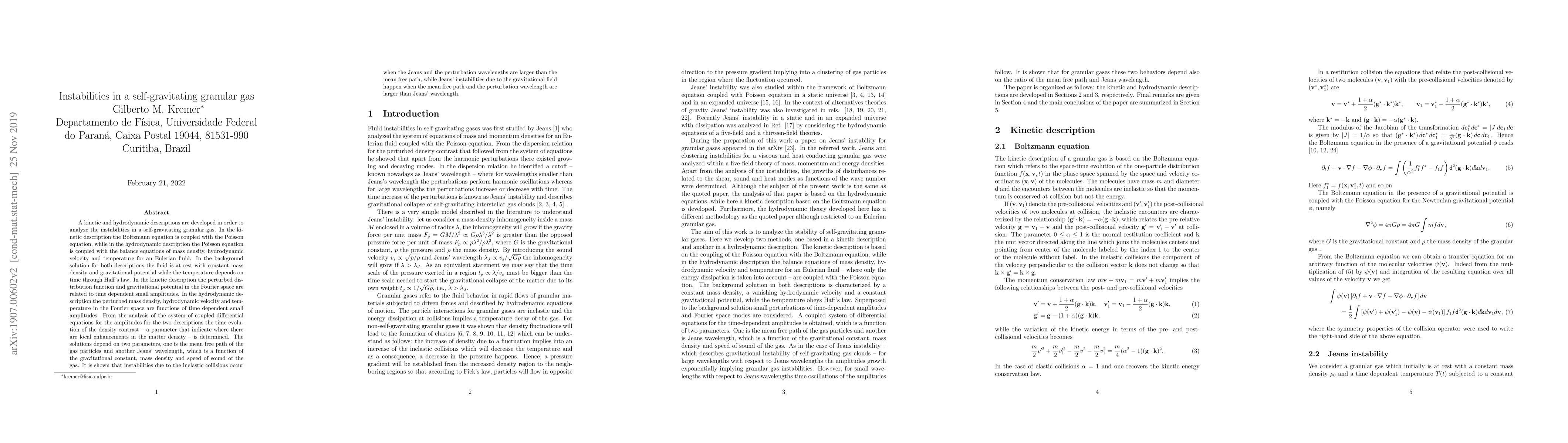 A kinetic and hydrodynamic descriptions are developed in order to analyze the instabilities of a granular gas in the presence of a gravitational field. In the kinetic description the Boltzmann equation is coupled with the Poisson equation, while in the hydrodynamic description the Poisson equation is coupled with the balance equations of mass density, hydrodynamic velocity and temperature for an Eulerian fluid. In the background solution for both descriptions the fluid is at rest with constant mass density and gravitational potential while the temperature depends on time through Haff's law. In the kinetic description the perturbed distribution function and gravitational potential in the Fourier space are related to time dependent small amplitudes. In the hydrodynamic description the perturbed mass density, hydrodynamic velocity and temperature in the Fourier space are functions of time dependent small amplitudes. From the analysis of the system of coupled differential equations for the amplitudes for the two descriptions the time evolution of the density contrast -- a parameter that indicate where there are local enhancements in the matter density -- is determined. The solutions depend on two parameters, one is the mean free path of the gas particles and another Jeans' wavelength, which is a function of the gravitational constant, mass density and speed of sound of the gas. It is shown that instabilities due to the inelastic collisions occur when the Jeans and the perturbation wavelengths are larger than the mean free path, while Jeans' instabilities due to the gravitational field happen when the mean free path and the perturbation wavelength are larger than Jeans' wavelength.