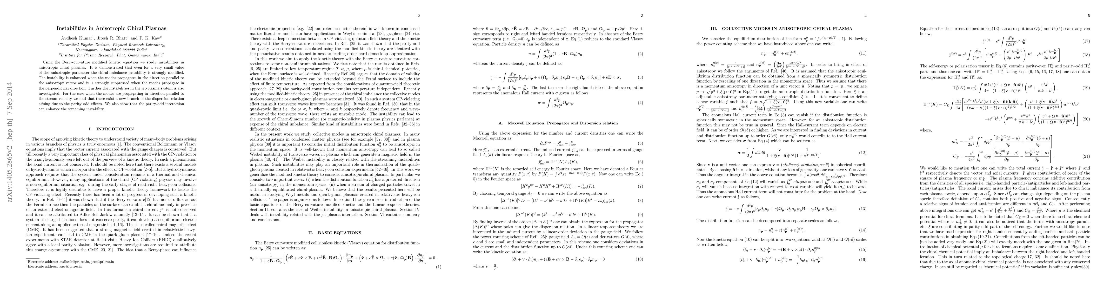 This paper investigates instabilities in anisotropic chiral plasmas using a modified kinetic equation, revealing that even minor anisotropy significantly alters the chiral-imbalance instability. The instability is enhanced parallel to the anisotropy vector and suppressed perpendicularly, with a new dispersion branch arising in jet-plasma systems due to parity-odd effects, enhancing the streaming instability.