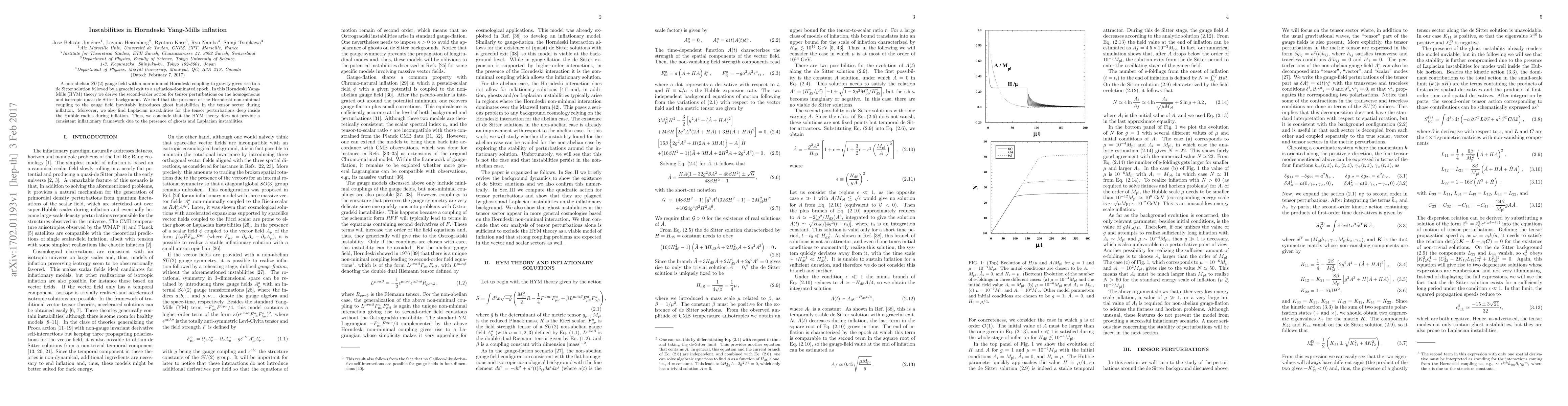 The paper investigates the Horndeski Yang-Mills (HYM) theory, finding that non-minimal Horndeski coupling to an $SU(2)$ gauge field leads to ghost and Laplacian instabilities in tensor perturbations during inflation, rendering the theory inconsistent for inflationary cosmology.