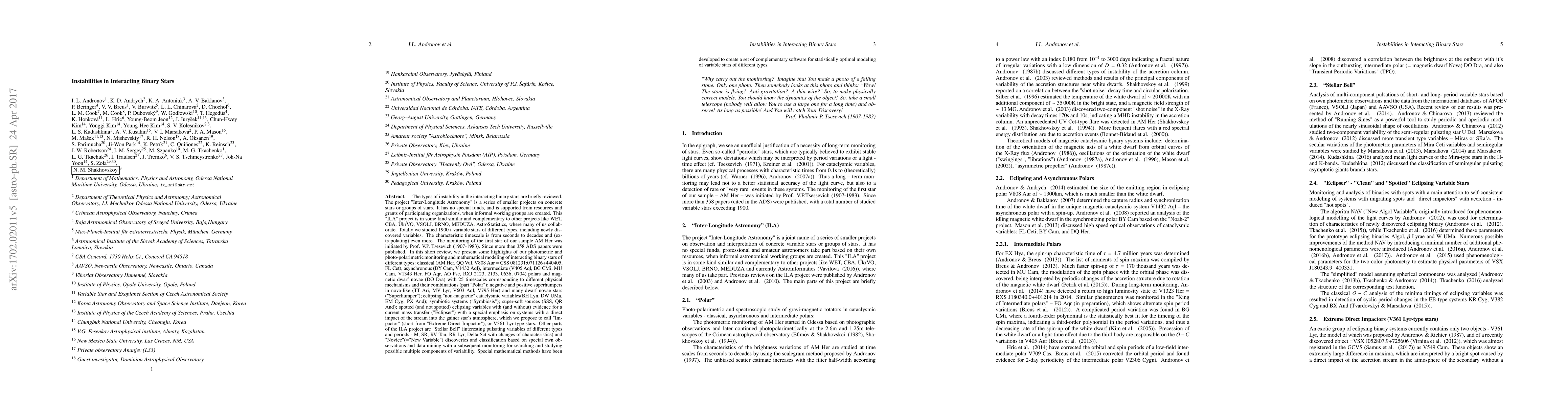 The types of instability in the interacting binary stars are reviewed. The project "Inter-Longitude Astronomy" is a series of smaller projects on concrete stars or groups of stars. It has no special funds, and is supported from resources and grants of participating organizations, when informal working groups are created. Totally we studied 1900+ variable stars of different types. The characteristic timescale is from seconds to decades and (extrapolating) even more. The monitoring of the first star of our sample AM Her was initiated by Prof. V.P. Tsesevich (1907-1983). Since more than 358 ADS papers were published. Some highlights of our photometric and photo-polarimetric monitoring and mathematical modelling of interacting binary stars of different types are presented: classical, asynchronous, intermediate polars and magnetic dwarf novae (DO Dra) with 25 timescales corresponding to different physical mechanisms and their combinations (part "Polar"); negative and positive superhumpers in nova-like and many dwarf novae stars ("Superhumper"); eclipsing "non-magnetic" cataclysmic variables; symbiotic systems ("Symbiosis"); super-soft sources (SSS, QR And); spotted (and not spotted) eclipsing variables with (and without) evidence for a current mass transfer ("Eclipser") with a special emphasis on systems with a direct impact of the stream into the gainer star's atmosphere, or V361 Lyr-type stars. Other parts of the ILA project are "Stellar Bell" (interesting pulsating variables of different types and periods - M, SR, RV Tau, RR Lyr, Delta Sct) and "Novice"(="New Variable") discoveries and classification with a subsequent monitoring for searching and studying possible multiple components of variability. Special mathematical methods have been developed to create a set of complementary software for statistically optimal modelling of variable stars of different types.
