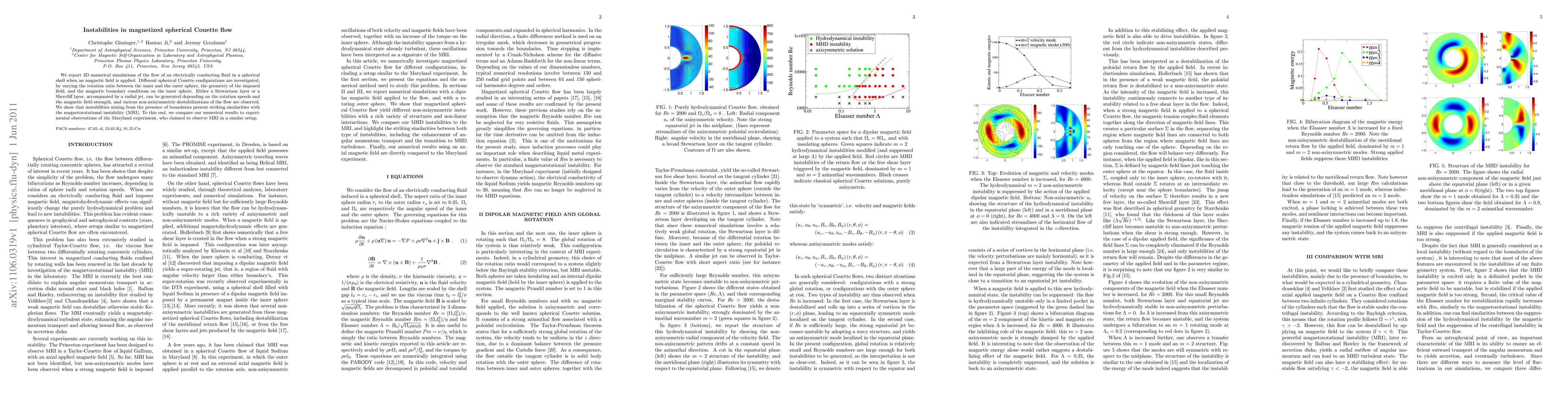 This study investigates 3D numerical simulations of electrically conducting fluid flow in a magnetized spherical Couette configuration, revealing various instabilities and non-axisymmetric destabilizations. The research compares the observed instabilities to the magnetorotational instability (MRI) and aligns findings with experimental observations from the Maryland experiment.