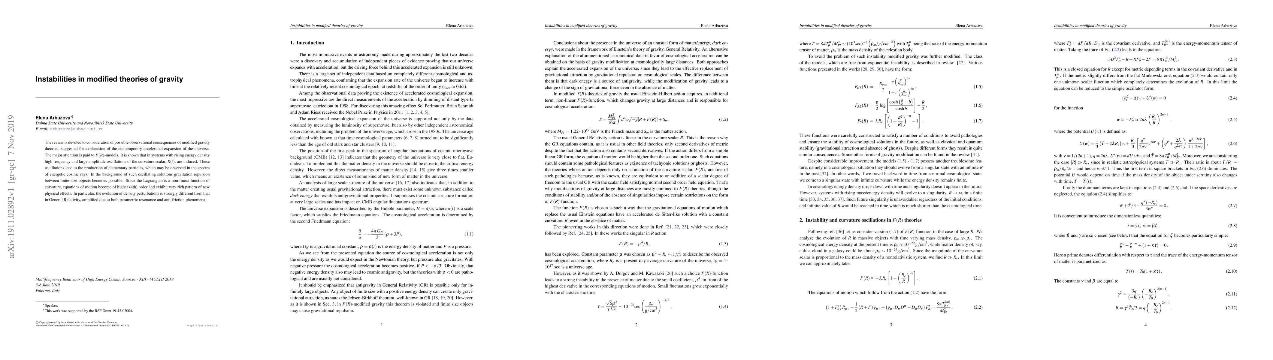 The review is devoted to consideration of possible observational consequences of modified gravity theories, suggested for explanation of the contemporary accelerated expansion of the universe. The major attention is paid to F(R)-models. It is shown that in systems with rising energy density high frequency and large amplitude oscillations of the curvature scalar, R(t), are induced. These oscillations lead to the production of elementary particles, which may be observed in the spectra of energetic cosmic rays. In the background of such oscillating solutions gravitation repulsion between finite-size objects becomes possible. Since the Lagrangian is a non-linear function of curvature, equations of motion become of higher (4th) order and exhibit very rich pattern of new physical effects. In particular, the evolution of density perturbations is strongly different from that in General Relativity, amplified due to both parametric resonance and anti-friction phenomena.
