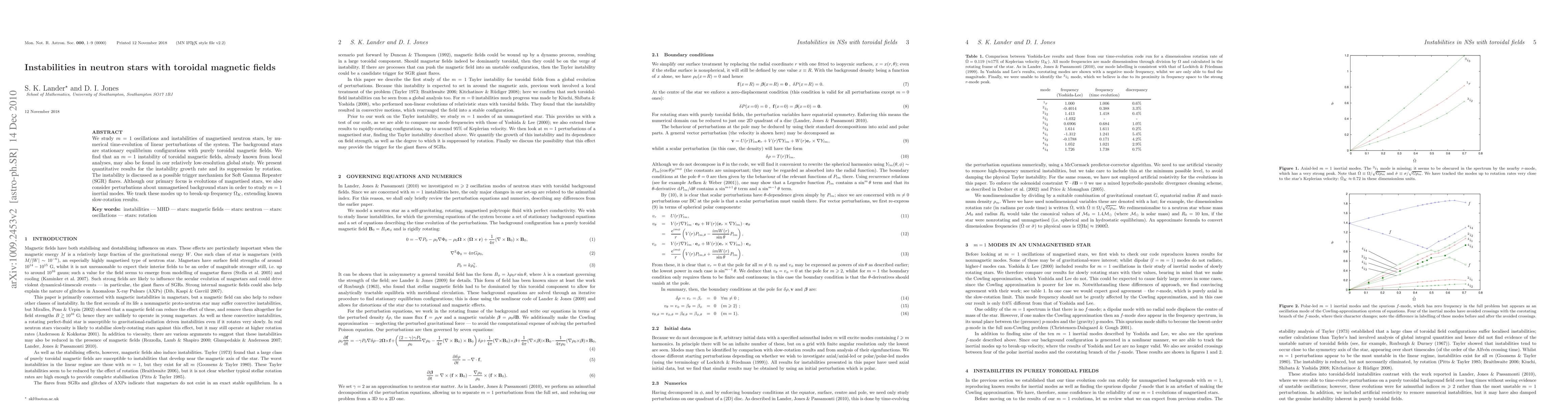 This paper investigates $m=1$ oscillations and instabilities in neutron stars with toroidal magnetic fields, finding that an $m=1$ instability can trigger Soft Gamma Repeater flares. The study also extends the analysis of $m=1$ inertial modes in unmagnetised stars up to their break-up frequency.
