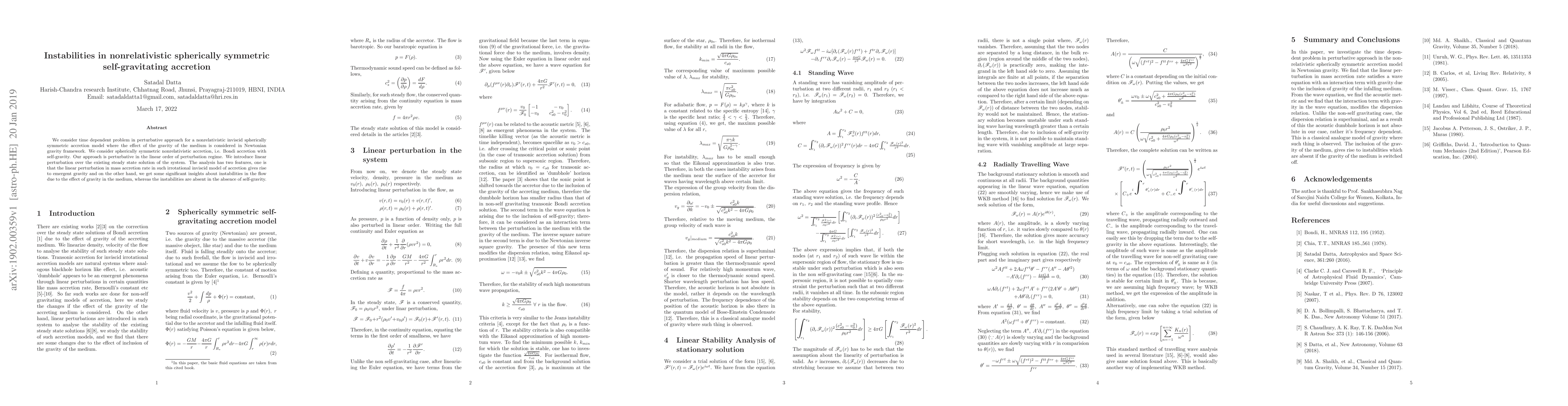 This paper investigates instabilities in nonrelativistic spherically symmetric Bondi accretion with self-gravity using a perturbative approach. It finds that linear perturbations in the mass accretion rate lead to emergent gravity and reveal significant instabilities in the flow due to the medium's gravity, which are absent without self-gravity.