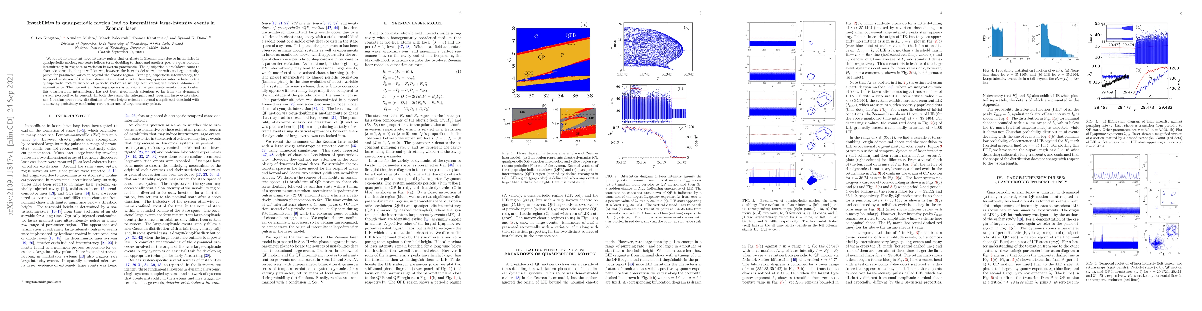 This paper investigates the intermittent large-intensity pulses in a Zeeman laser caused by instabilities in quasiperiodic motion, revealing two routes to chaos: one via torus-doubling and another via quasiperiodic intermittency. The latter shows rare, large-intensity events with a non-Gaussian probability distribution, indicating their infrequent occurrence.