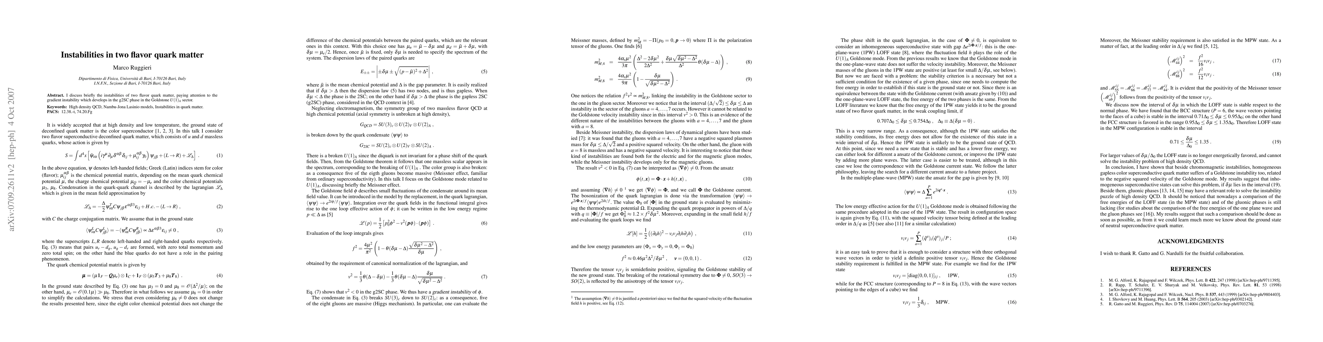 I discuss briefly the instabilities of two flavor quark matter, paying attention to the gradient instability which develops in the g2SC phase in the Goldstone $U(1)_A$ sector.