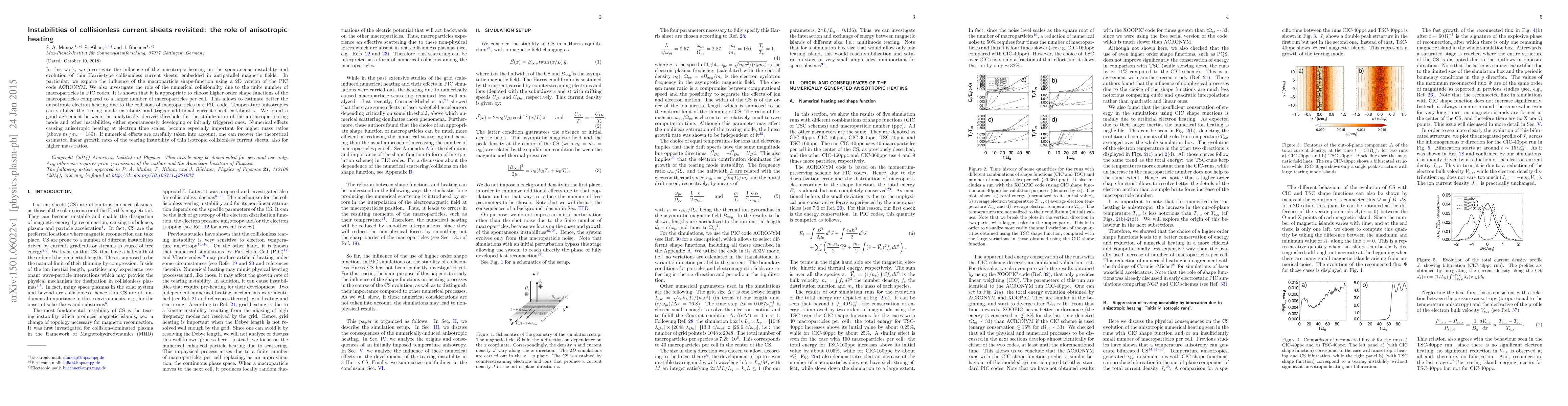 This paper examines how anisotropic heating affects the instabilities in thin collisionless current sheets, using a 2D PIC code. It finds that higher-order macroparticle shape functions are better at estimating anisotropic electron heating, stabilizing the tearing mode and triggering additional instabilities, with numerical effects being crucial for higher mass ratios.