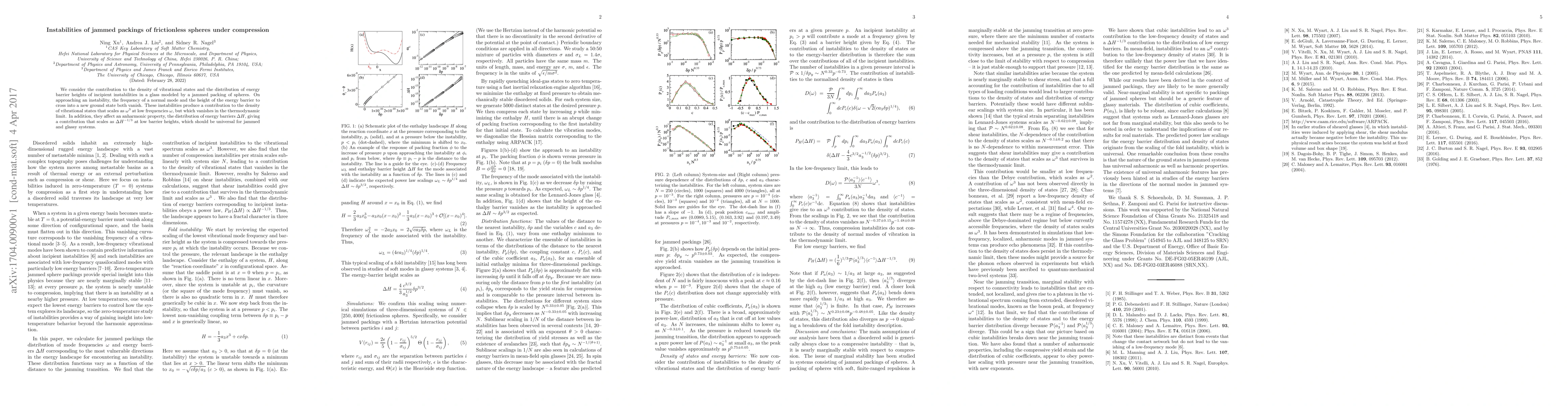 Research investigates instabilities in glassy materials composed of frictionless spheres under compression, revealing a $ extit{scaling} extit{behaviors}$ for vibrational states and energy barriers at low frequencies and barrier heights, respectively.
