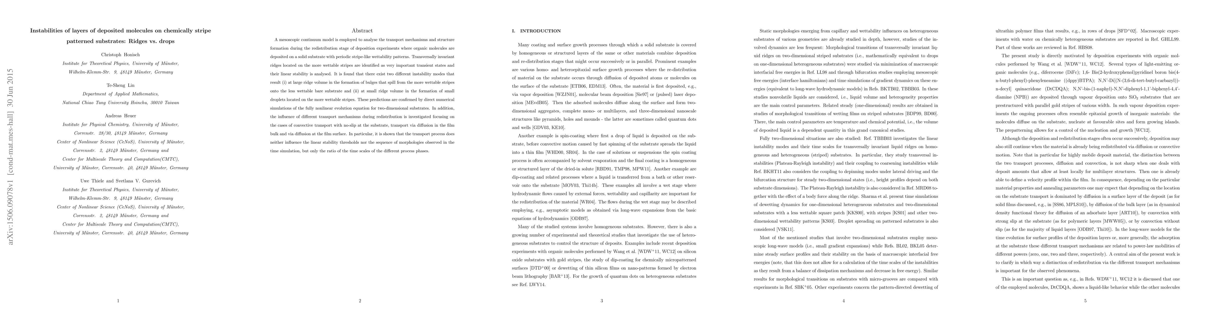 A mesoscopic continuum model is employed to analyse the transport mechanisms and structure formation during the redistribution stage of deposition experiments where organic molecules are deposited on a solid substrate with periodic stripe-like wettability patterns. Transversally invariant ridges located on the more wettable stripes are identified as very important transient states and their linear stability is analysed. It is found that there exist two different instability modes that result (i) at large ridge volume in the formation of bulges that spill from the more wettable stripes onto the less wettable bare substrate and (ii) at small ridge volume in the formation of small droplets located on the more wettable stripes. These predictions are confirmed by direct numerical simulations of the fully nonlinear evolution equation for two-dimensional substrates. In addition, the influence of different transport mechanisms during redistribution is investigated focusing on the cases of convective transport with no-slip at the substrate, transport via diffusion in the film bulk and via diffusion at the film surface. In particular, it is shown that the transport process does neither influence the linear stability thresholds nor the sequence of morphologies observed in the time simulation, but only the ratio of the time scales of the different process phases.