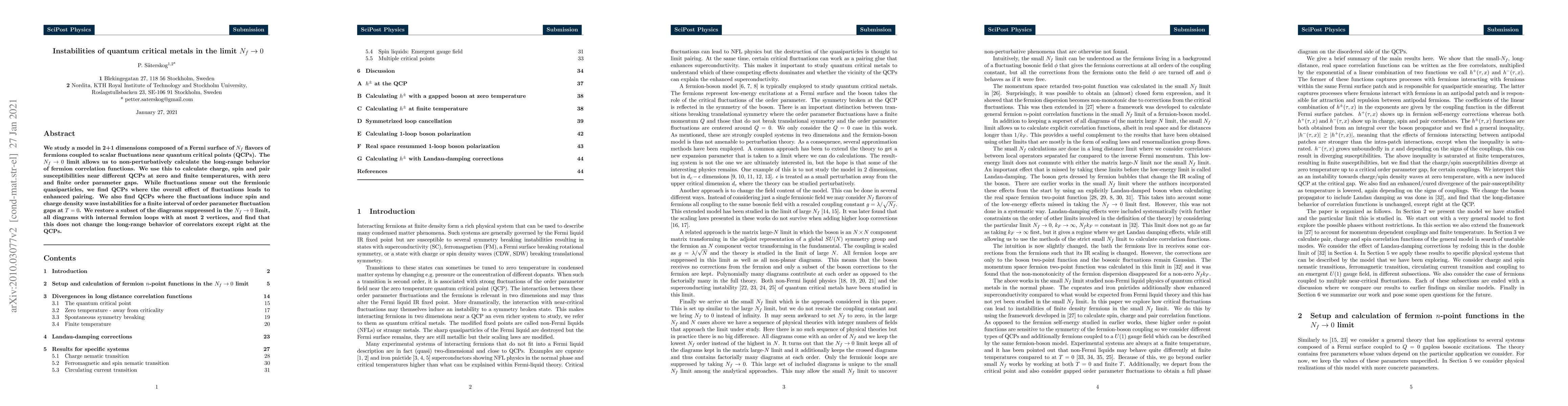 We study a model in 2+1 dimensions composed of a Fermi surface of $N_f$ flavors of fermions coupled to scalar fluctuations near quantum critical points (QCPs). The $N_f\rightarrow0$ limit allows us to non-perturbatively calculate the long-range behavior of fermion correlation functions. We use this to calculate charge, spin and pair susceptibilities near different QCPs at zero and finite temperatures, with zero and finite order parameter gaps. While fluctuations smear out the fermionic quasiparticles, we find QCPs where the overall effect of fluctuations leads to enhanced pairing. We also find QCPs where the fluctuations induce spin and charge density wave instabilities for a finite interval of order parameter fluctuation gaps at $T=0$. We restore a subset of the diagrams suppressed in the $N_f\rightarrow0$ limit, all diagrams with internal fermion loops with at most 2 vertices, and find that this does not change the long-range behavior of correlators except right at the QCPs.