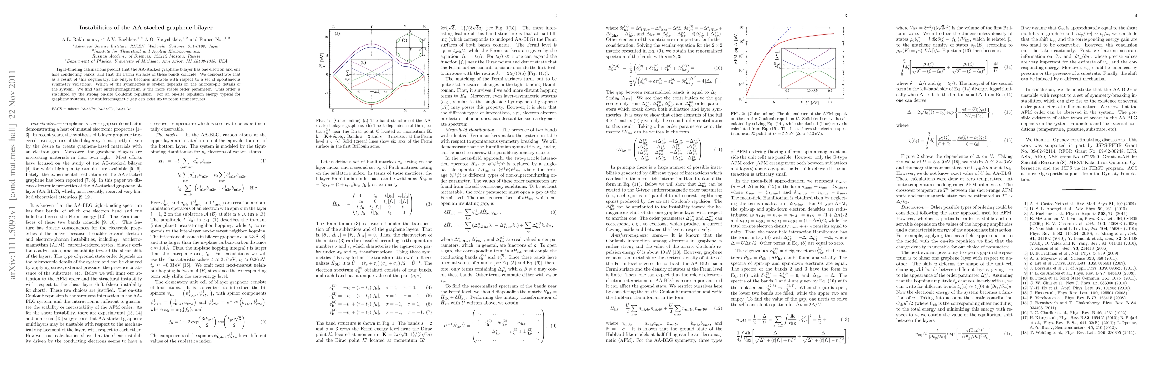 Researchers show that AA-stacked graphene bilayer is unstable due to degenerate electron and hole conducting bands, leading to spontaneous symmetry violations, with antiferromagnetism being the more stable order parameter.