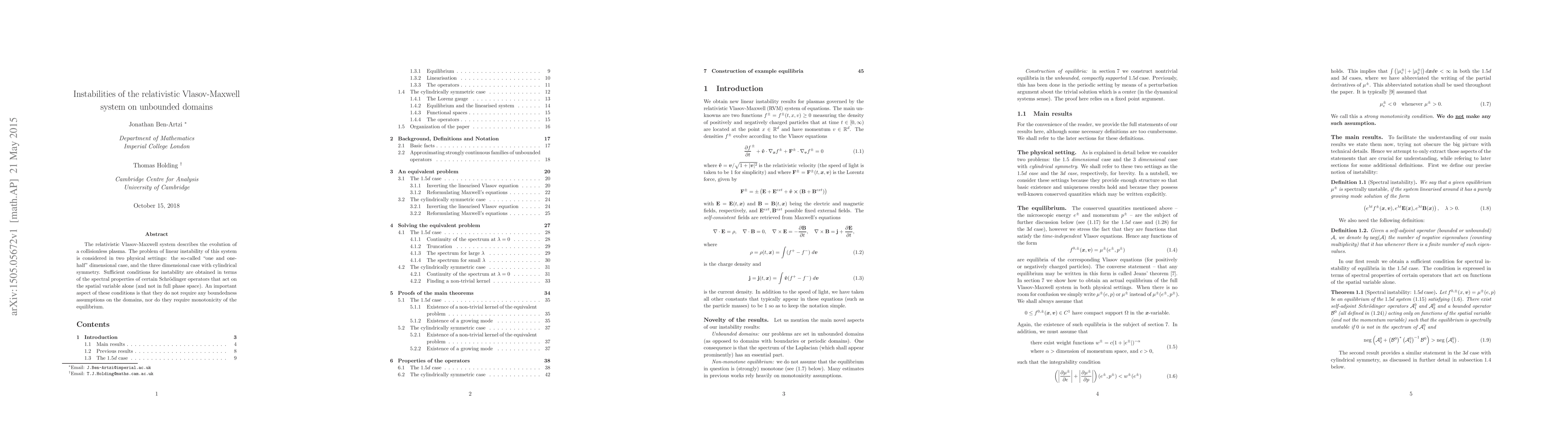 Research investigates instability in relativistic Vlasov-Maxwell system on unbounded domains without requiring boundedness assumptions or monotonicity of the equilibrium. Sufficient conditions for instability are found using spectral properties of certain Schr"odinger operators.