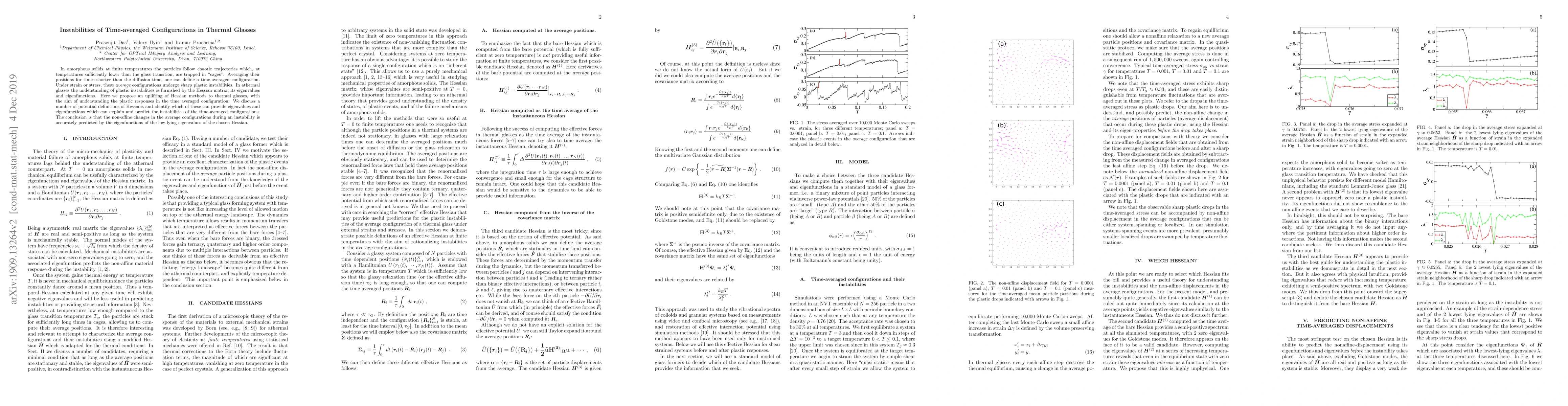 In amorphous solids at finite temperatures the particles follow chaotic trajectories which, at temperatures sufficiently lower than the glass transition, are trapped in "cages". Averaging their positions for times shorter than the diffusion time, one can define a time-averaged configuration. Under strain or stress, these {\em average} configurations undergo sharp plastic instabilities. In athermal glasses the understanding of plastic instabilities is furnished by the Hessian matrix, its eigenvalues and eigenfunctions. Here we propose an uplifting of Hessian methods to thermal glasses, with the aim of understanding the plastic responses in the time-averaged configuration. We discuss a number of potential definitions of Hessians and identify which of these can provide eigenvalues and eigenfunctions which can explain and predict the instabilities of the time-averaged configurations. The conclusion is that the non-affine changes in the average configurations during an instability is accurately predicted by the eigenfunctions of the low-lying eigenvalues of the chosen Hessian.