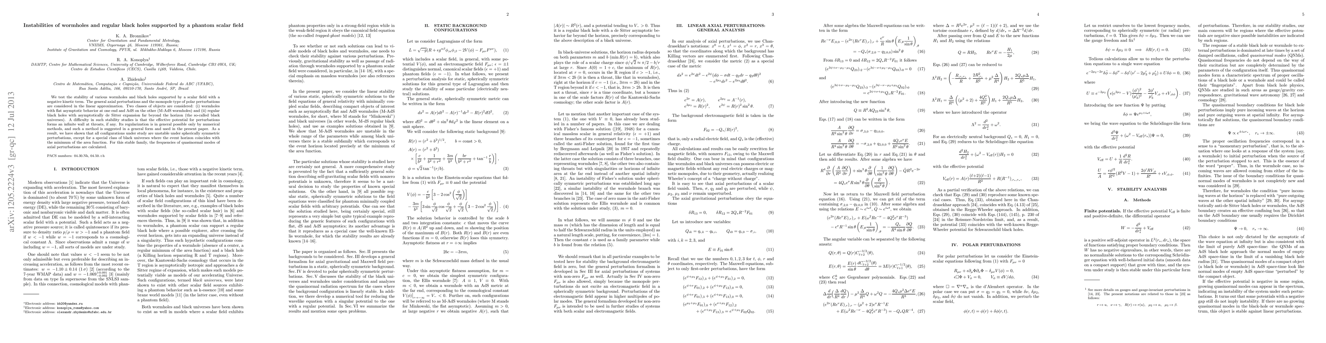 We test the stability of various wormholes and black holes supported by a scalar field with a negative kinetic term. The general axial perturbations and the monopole type of polar perturbations are considered in the linear approximation. Two classes of objects are considered: (i) wormholes with flat asymptotic behavior at one end and AdS on the other (M-AdS wormholes) and (ii) regular black holes with asymptotically de Sitter expansion far beyond the horizon (the so-called black universes). A difficulty in such stability studies is that the effective potential for perturbations forms an infinite wall at throats, if any. Its regularization is in general possible only by numerical methods, and such a method is suggested in a general form and used in the present paper. As a result, we have shown that all configurations under study are unstable under spherically symmetric perturbations, except for a special class of black universes where the event horizon coincides with the minimum of the area function. For this stable family, the frequencies of quasinormal modes of axial perturbations are calculated.